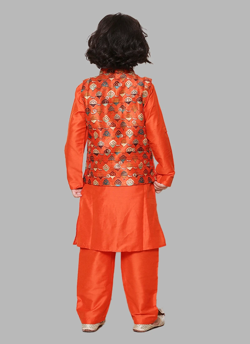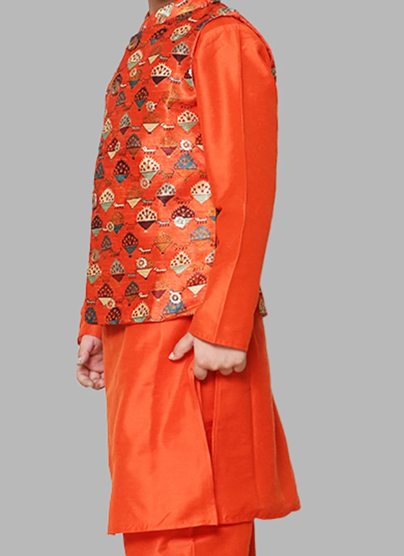 Be your own style icon in this orange cotton silk boys bandiset will make you stylish and graceful. It plain work crafted with full sleeves and collar neckstyle looks chic and ideal for any affair. This set comes with orange cotton silk pant bottom and orange silk with printed work nehru jacket.
