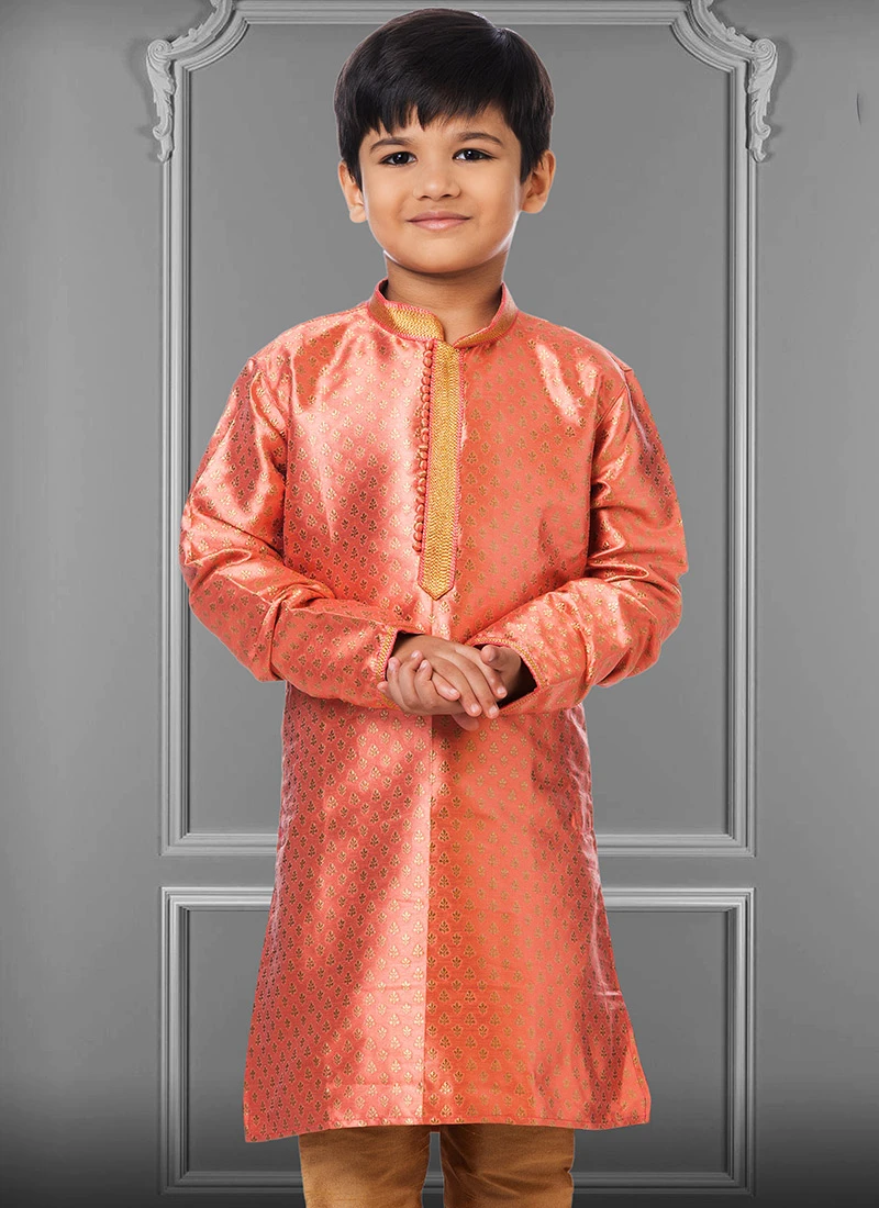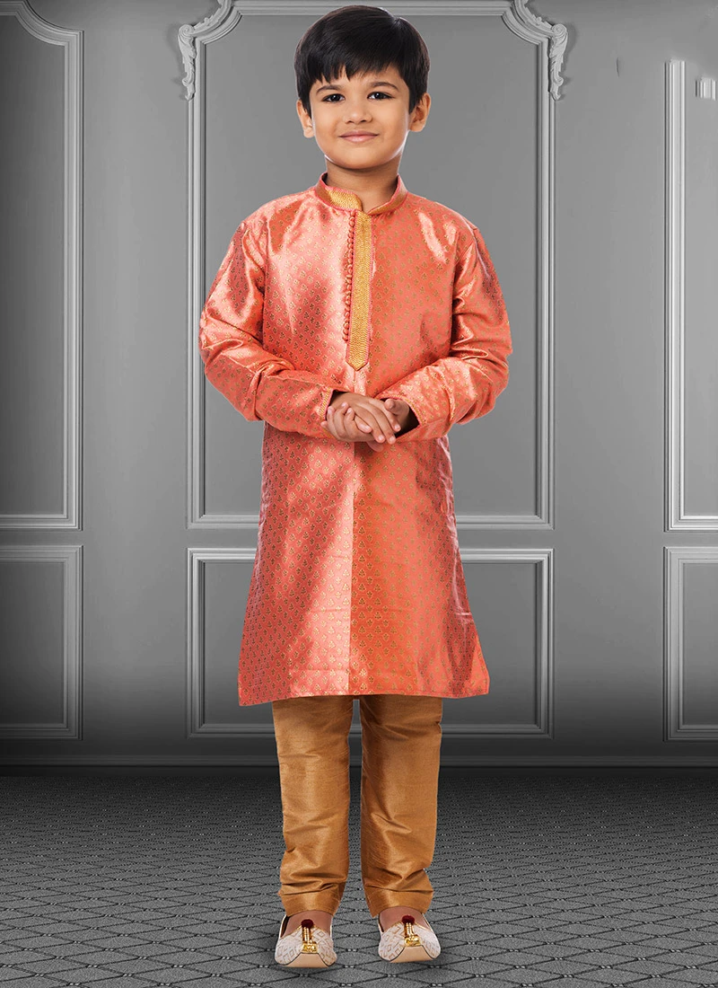Fashion and pattern could be at the peak with this orange jacquard silk boys kurta pyjama enriched with jacquard work over the kurta crafted with full sleeves and mandarin collar neckstyle is representing a royalty in itself. This Kurta pyjama comes with gold dupion silk chudi pant bottom.
