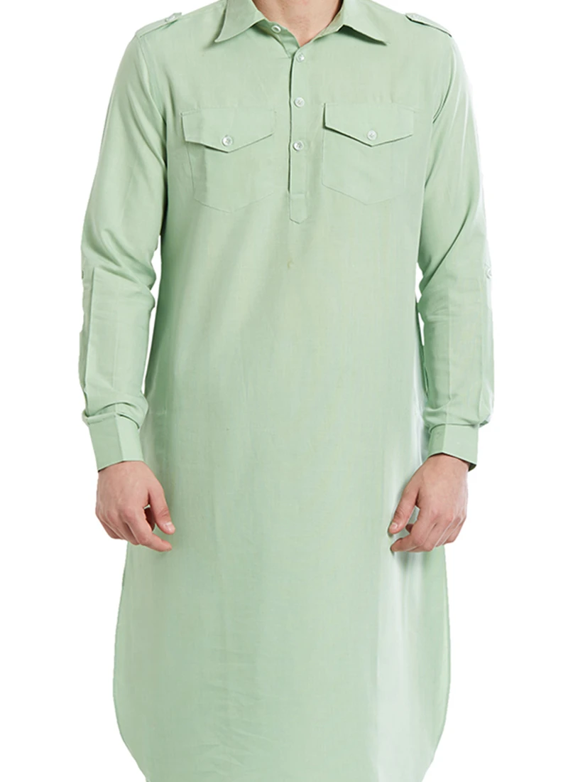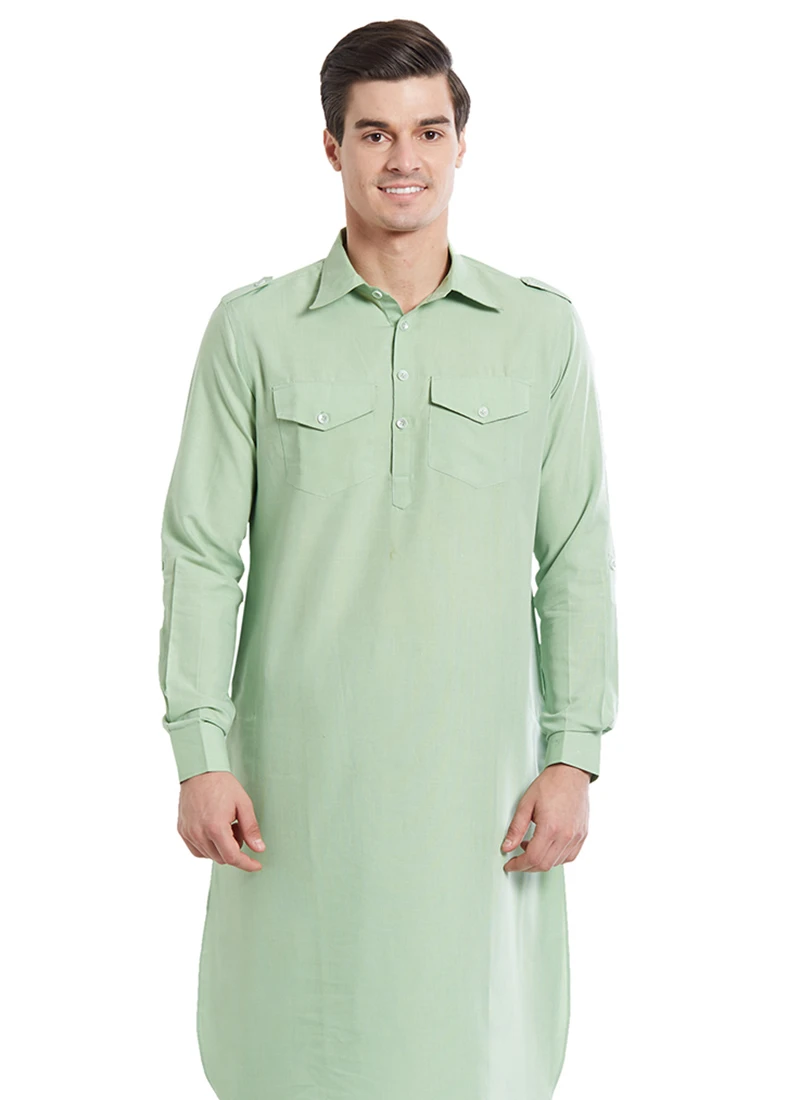 Pale green blended cotton plain pathani set with two square pockets on the yoke. Comes with matching bottom.