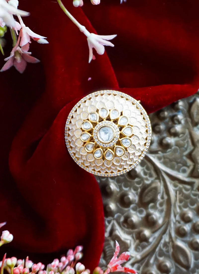 Surrounding the central Kundan stone are delicate and intricate floral patterns adorned with smaller Kundan stones. These embellishments add depth and dimension to the ring creating a visual masterpiece that captures the essence of traditional Indian jewelry. Each tiny detail is meticulously crafted showcasing the artisans dedication to creating a piece of art that resonates with grace and sophistication.