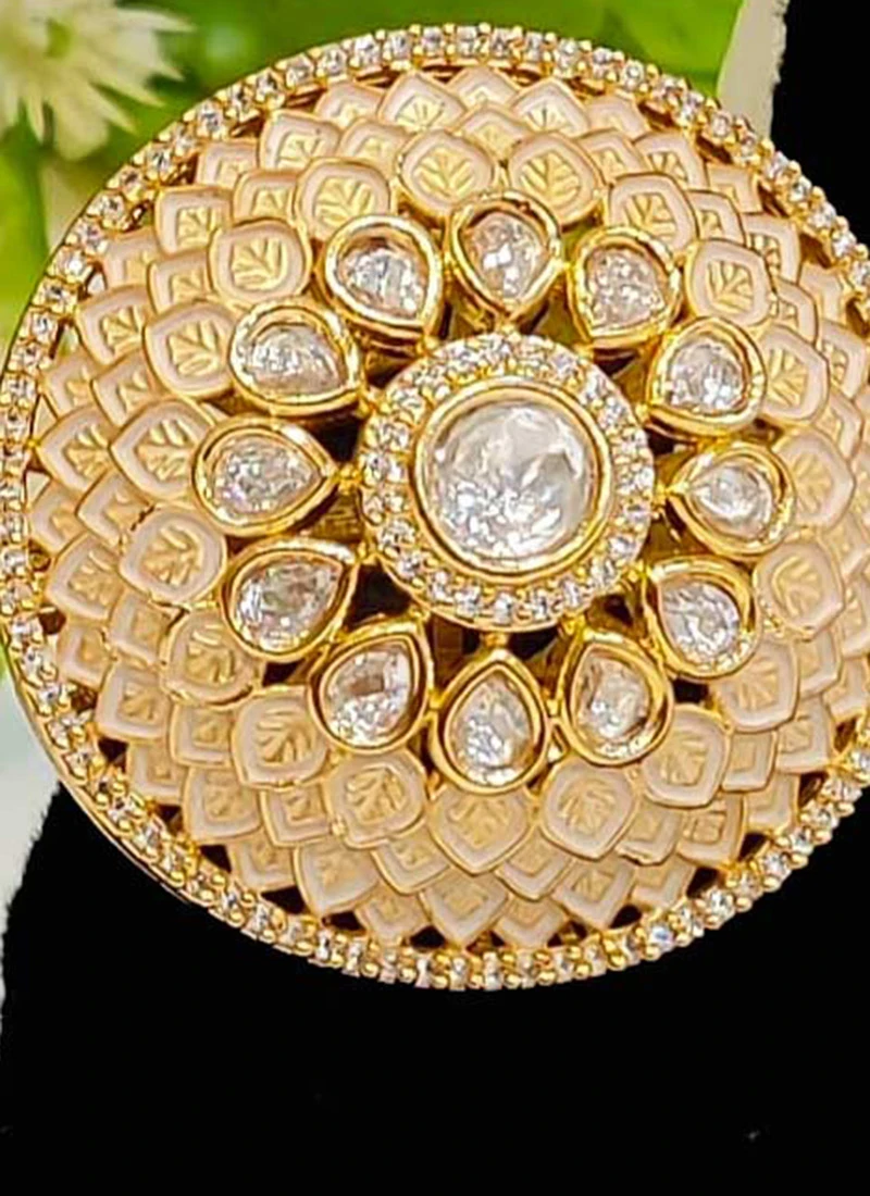 At the heart of this exquisite ring lies a radiant peachcolored Kundan stone known for its captivating luster and timeless appeal. The Kundan setting enhances the beauty of the stone allowing it to shimmer and sparkle in the light. The warm peach hue of the stone adds a touch of softness and femininity to the overall design making it a perfect choice for various occasions.