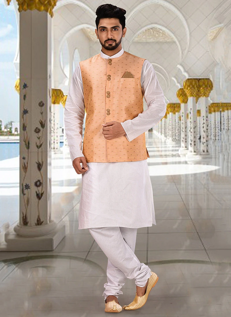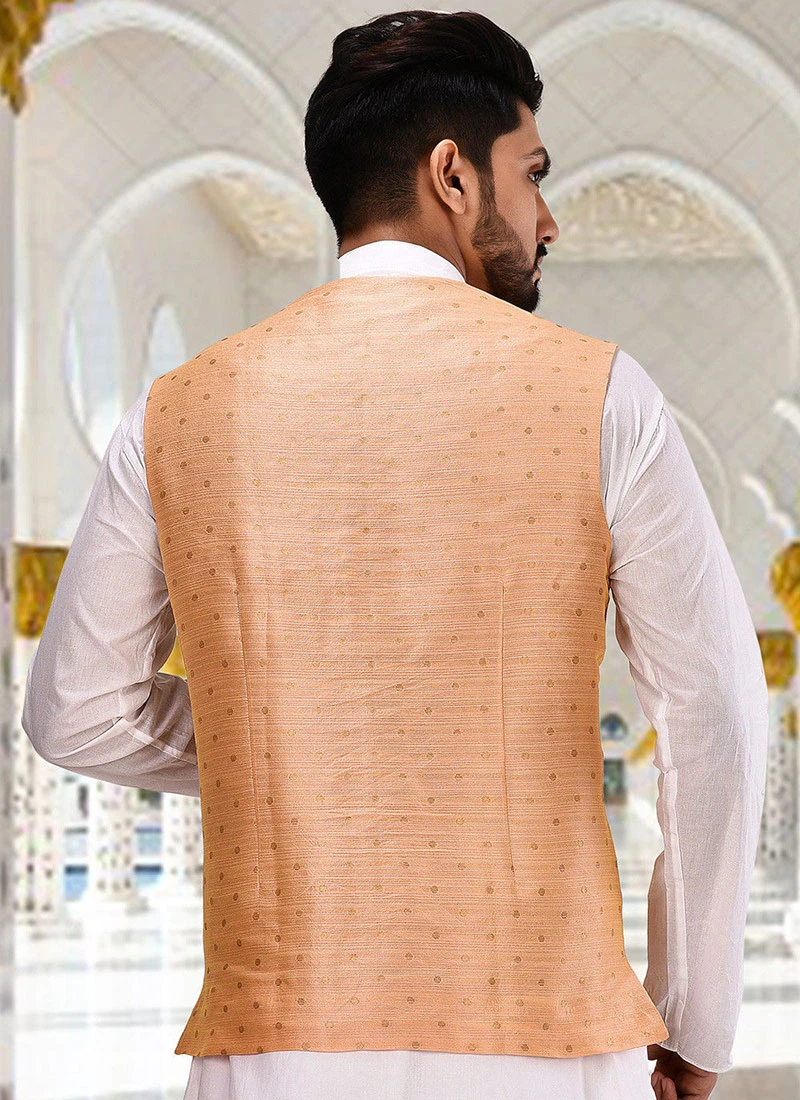 Add the sense of beauty by this peach cotton nehru jacket crafted with mandarin collar neck and sleeveless enriched with jacqiard work is representing royalty in itself.