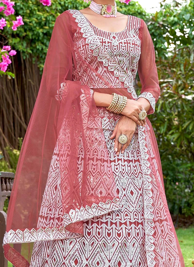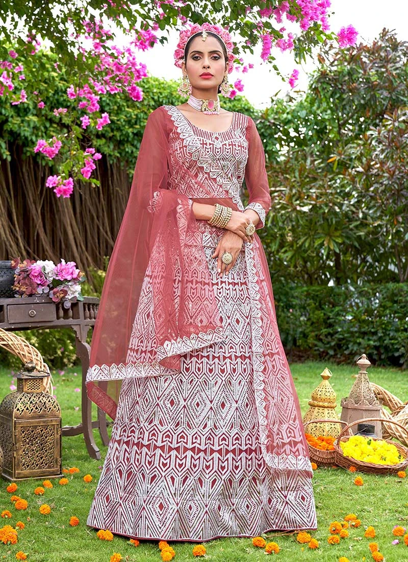 The Lehenga the focal point of this ensemble is crafted from highquality peachcoloured net fabric. The net fabric adds an element of delicacy and grace to the outfit making it flow beautifully with every step. The soft and subtle peach hue exudes a sense of femininity and charm.
