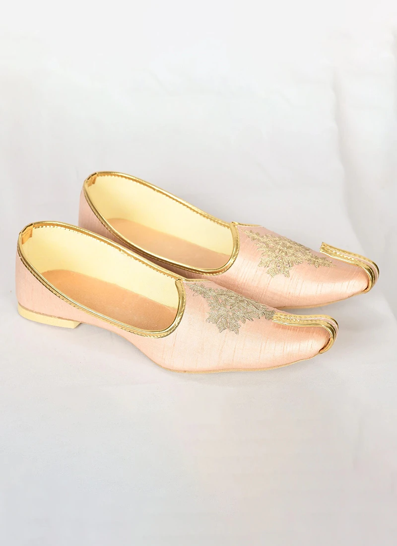 Peach color raw silk mojris embellished with hand work and chic for partywear.