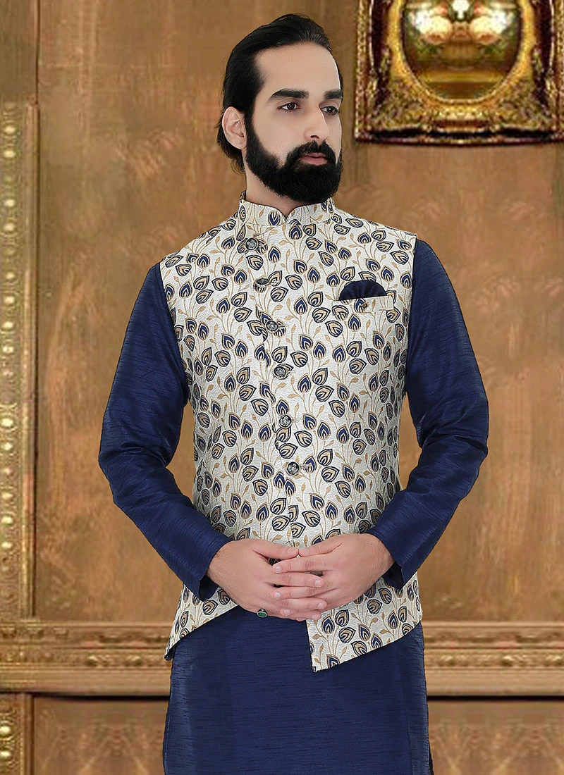 Peacock blue art silk bandhgala jacket enriched with brocade crafted with mandiran collar is representing a royalty in itself. The outfit will add a regal touch to your personality.