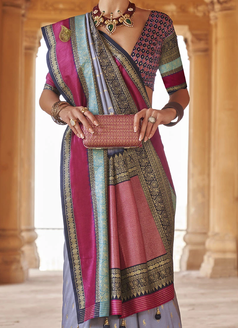 Comes with unstitched blouse fabric. To have the blouse stitched, please select the custom tailoring options. Blouses with elaborate patterns and colors are used for photo-shoot. Color and pattern of the blouse might not be as shown in the image.