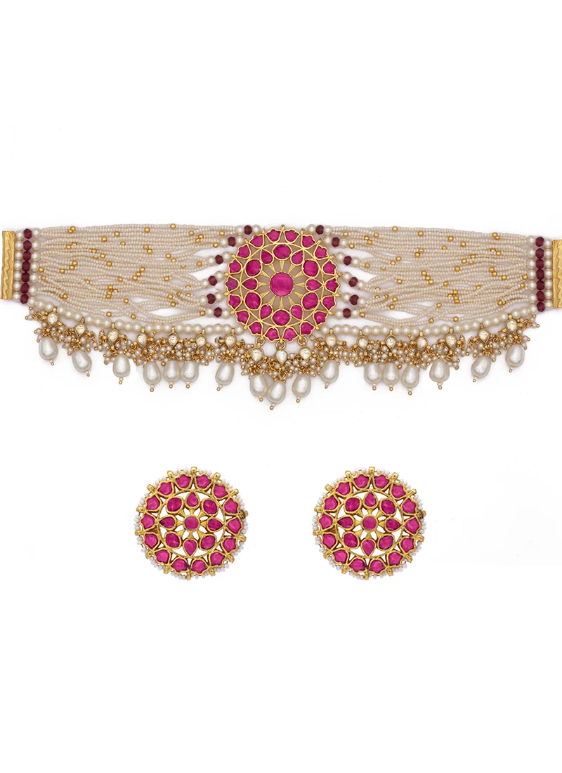 Indulge in the exquisite beauty of our Pink Alloy Moti N Beads Choker a piece that seamlessly combines timeless elegance with a touch of contemporary charm. This choker is a celebration of femininity featuring pearls and beads in a delightful shade of pink. The Pink Alloy Moti N Beads Choker showcases an intricate design that captures the essence of sophistication and grace. The alloy chain is adorned with lustrous pink moti pearls and beads creating a harmonious and enchanting composition. Crafted from premiumquality alloy this choker is designed to endure and retain its radiance. The alloy is lightweight ensuring your comfort while wearing it for extended periods. The Pink Alloy Moti N Beads Choker is a versatile accessory that effortlessly complements a variety of outfits. Whether youre attending a wedding a formal gathering or simply want to add a touch of sophistication to your everyday look this choker is the perfect choice.Pair this choker with ethnic ensembles like sarees lehengas or anarkalis to enhance your traditional charm.Wear it with contemporary dresses or tops to create a fusion look that combines classic elegance with modern style.Gift this exquisite choker to a loved one or yourself as a symbol of elegance and grace.we are dedicated to providing you with exceptional jewellery that captures your unique style and personality. The Pink Alloy Moti N Beads Choker reflects our commitment to offering you pieces that stand out for their beauty and quality.By choosing this choker youre embracing a timeless accessory that celebrates the beauty of pearls and the allure of pink. Elevate your style with the Pink Alloy Moti N Beads Choker. Order yours today and make a statement of sophistication and charm.