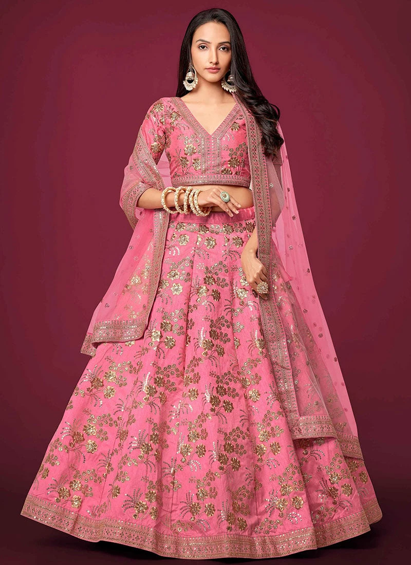Comes with semi -stitched lehenga, un stitched choli and dupatta fabric. To have it stitched, please select the custom tailoring options. Lehenga with elaborate patterns and colors are used for photo-shoot. Color and pattern of the lehenga might not be as shown in the image.