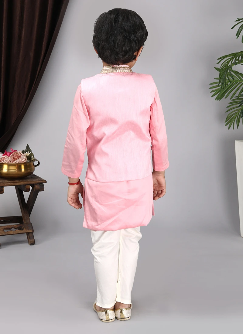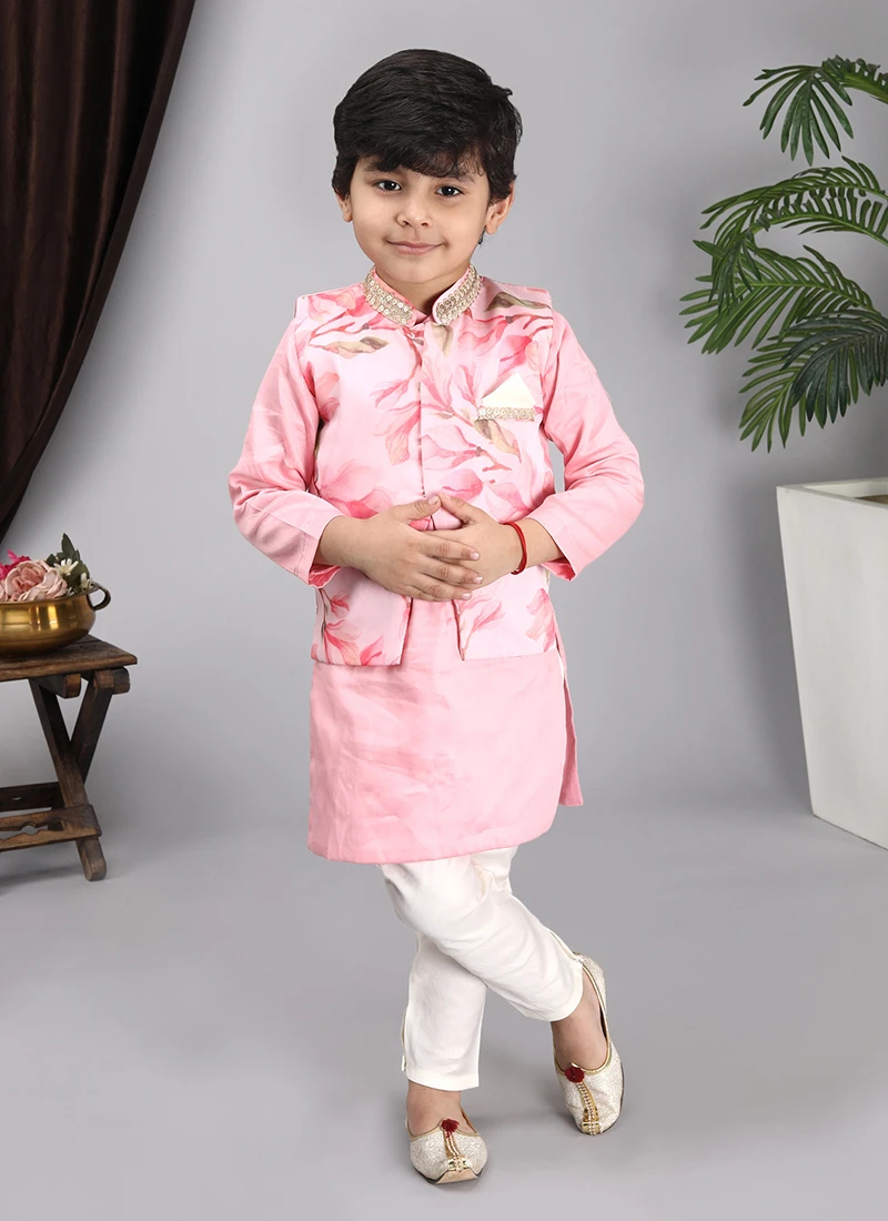 Men splendor is magnified tenfold with this pink cotton boys bandiset will make you stylish and graceful. It plain work crafted with full sleeves and collar neckstyle looks chic and ideal for any affair. This set comes with off white cotton pant bottom and pink color art silk with printed work nehru jacket.