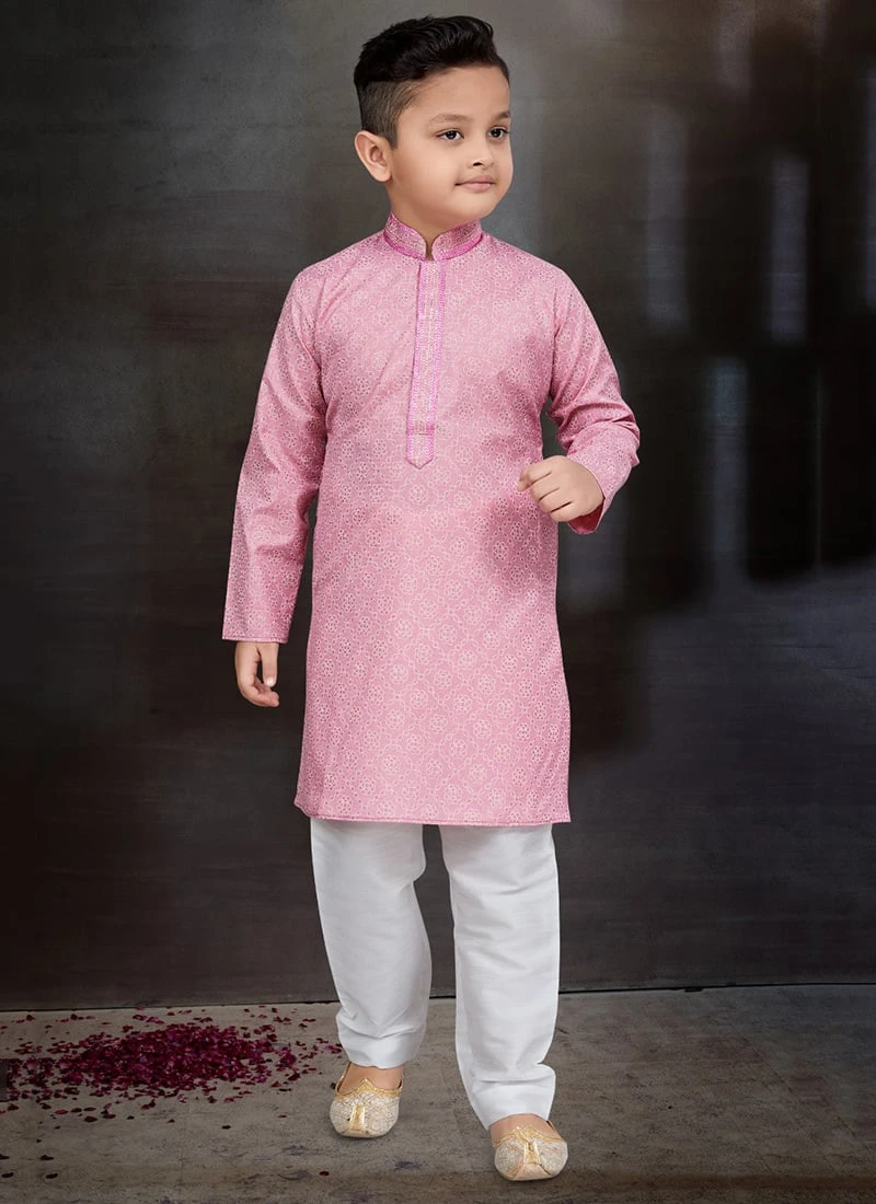 In summary the Pink Blended Cotton Printed Kids Boys Kurta Pyjama is a delightful and stylish outfit that combines comfort tradition and modern design. Its designed to make young boys look and feel their best on special occasions while allowing them to move freely and comfortably. This ensemble is a testament to the rich and diverse Indian fashion heritage and is sure to make your child stand out with its unique charm and elegance.
