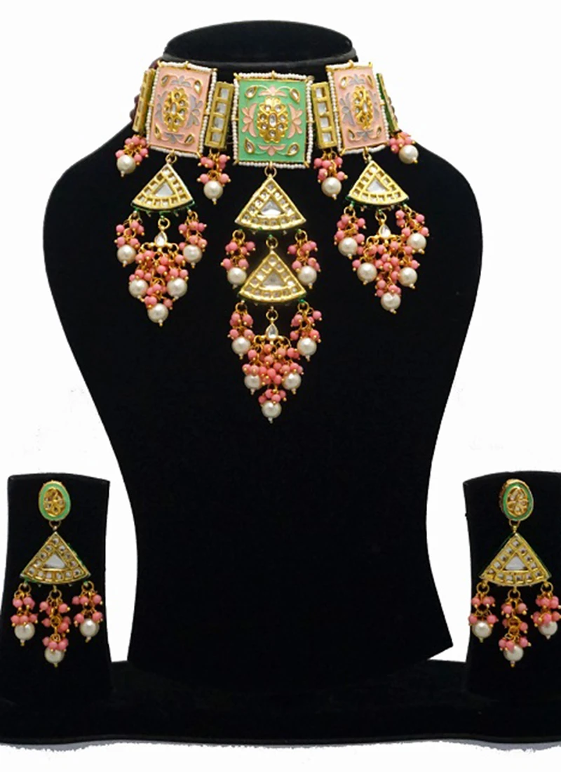 The craftsmanship of this necklace set is truly exceptional. Each kundan stone is carefully set in a secure manner ensuring durability and longevity. The metal used in the setting is often highquality alloy providing strength and stability to the entire piece. Additionally the set may be embellished with tiny pearls or crystals adding a subtle sparkle that complements the kundan stones beautifully.