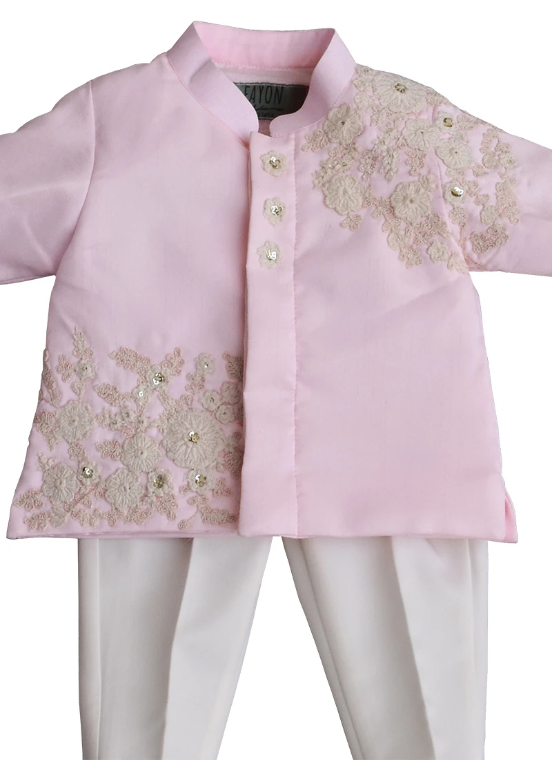 Fayon kids presents pink dupion art silk kurta pyjama with embroidered foliage and floral patterns on the kurta. Comes with matching bottom.