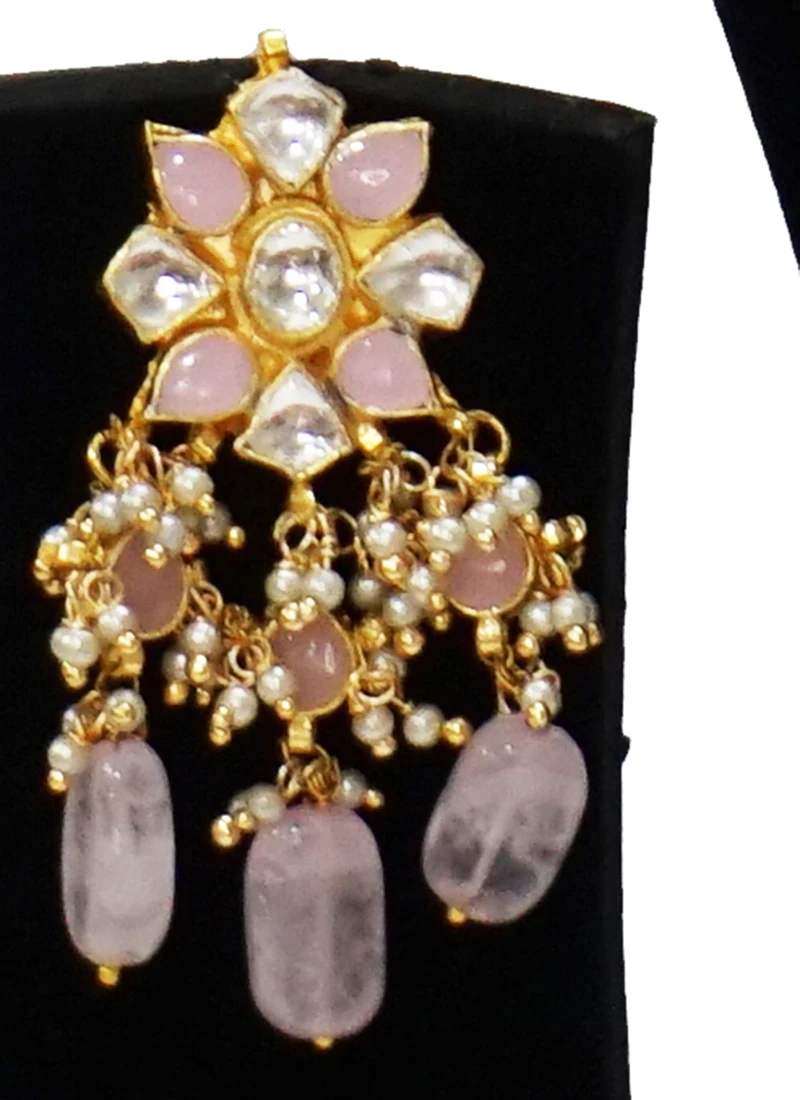 The Pink Kundan Necklace Set is a mesmerizing display of traditional elegance and regal allure. This exquisite jewelry ensemble showcases the timeless art of Kundan craftsmanship masterfully bringing to life the beauty of pink gemstones set in gleaming gold. With its intricate design and rich cultural heritage the Pink Kundan Necklace Set becomes a cherished treasure that exudes grace and sophistication. The Pink Kundan Necklace Set is a testament to the artistry of Kundan jewelrymaking a technique that has been passed down through generations. The pendant features meticulously set pink gemstones such as rubies or pink tourmalines into a base of refined gold. The stones are skillfully cut and arranged to create a captivating pattern that emanates grace and charm. Each gemstone is secured in place using a delicate foil technique allowing light to pass through and enhance the stones natural brilliance. The intricate Kundan work on the pendant adds depth and texture creating a mesmerizing visual display that captures the attention of all who behold it. The Pink Kundan Necklace Set derives its allure from the soft and alluring shades of pink gemstones. The pink hue symbolizes love femininity and tenderness adding a touch of romantic charm to the necklace set. The gentle sparkle of the gemstones reflects the wearers elegance capturing the essence of timeless beauty. The Pink Kundan Necklace Set effortlessly transitions from traditional to contemporary wear making it a versatile and cherished accessory for various occasions. Whether paired with an opulent ethnic ensemble for cultural celebrations or worn with a modern outfit for a touch of regal elegance this necklace set adds a regal grace that is truly captivating. The Pink Kundan Necklace Set is more than just a piece of jewelry it is a celebration of cultural heritage and traditional artistry. Kundan craftsmanship has its roots in ancient India and continues to be revered for its intricacy and beauty. Wearing this necklace set becomes an expression of appreciation for the rich artistic legacy that endures through time. The Pink Kundan Necklace Set becomes a symbol of timeless beauty and enduring allure. It serves as a reminder that true elegance stands the test of time and transcends fleeting trends. As a cherished piece of jewelry it becomes an heirloom that can be passed down through generations carrying with it the stories of love and admiration. In conclusion the Pink Kundan Necklace Set is a masterpiece of Kundan craftsmanship celebrating the beauty of pink gemstones set in radiant gold. With its intricate design regal allure and rich cultural heritage this necklace set becomes an emblem of grace and sophistication. As it graces the neckline of the wearer it becomes a radiant expression of timeless beauty and appreciation for the artistic legacy of Kundan jewelrymaking.