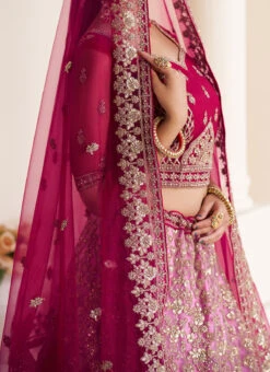 This lehenga is crafted from highquality pink net fabric which lends it a lightweight and ethereal appeal. The rich pink hue exudes sophistication and grace making it a popular choice among women who appreciate classic colors with a touch of modern flair.
