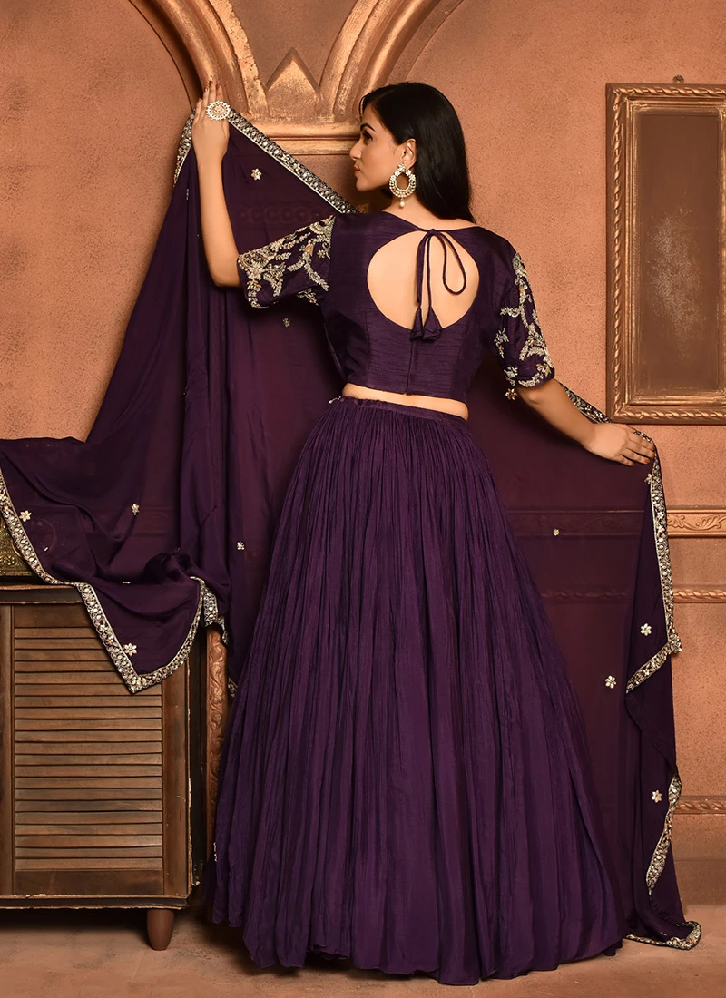 In the world of fashion certain garments are more than just pieces of cloth they are expressions of individuality and symbols of timeless elegance. The Purple Pure Silk Hand Work Lehenga is one such masterpiece a harmonious blend of tradition and contemporary style designed to make every woman feel like a regal diva embracing her unique style. This exquisite lehenga embodies the enduring charm of Indian fashion artistry and the beauty of individual expression. Crafted from pure silk a fabric celebrated for its luxurious sheen and soft flowing texture the Purple Pure Silk Hand Work Lehenga offers a tactile experience that is both opulent and comfortable. The choice of a rich purple hue adds an air of sophistication and individuality to the attire. Purple symbolizing creativity dignity and charm is a fitting choice for special occasions representing a celebration of the beauty of uniqueness. The silhouette of the Purple Pure Silk Hand Work Lehenga seamlessly blends traditional and modern design elements. It features an Aline cut with a fitted waist that accentuates the natural curves of the wearer and a flowing skirt that adds an ethereal quality to the ensemble. The lehengas design is a canvas for individual expression and timeless elegance. What truly sets this lehenga apart is the intricate handiwork that adorns it. The skirt blouse and accompanying dupatta are adorned with meticulous handembroidered motifs and beadwork celebrating the diversity of craftsmanship and design. These motifs draw inspiration from the rich tapestry of Indian culture featuring intricate florals paisleys and geometric patterns. Each motif is a testament to the skill and attention to detail of the artisans who lovingly craft this masterpiece. The accompanying blouse is also adorned with the same handembroidered work creating a seamless and elegant look. The synergy between the intricate embroidery and beadwork celebrates the beauty of individual expression as it showcases the craftsmanship and precision of the artisans. This lehenga is a versatile choice for various events from weddings and receptions to formal gatherings where every woman can wear it in her unique way. Wearing the Purple Pure Silk Hand Work Lehenga is about feeling both elegant and true to oneself. The pure silk fabric drapes gracefully and feels soft against the skin allowing for freedom of movement. The ensemble typically includes a matching blouse and a sheer dupatta providing a complete and regal look that can be tailored to reflect each womans individual style. To complete the look pair this lehenga with traditional Indian jewelry such as statement earrings a necklace and bangles. The sheer dupatta can be draped in various styles adding an additional layer of elegance that reflects personal preference and individuality. Footwear options can range from heeled sandals for a modern touch to traditional juttis for a nod to tradition allowing each woman to make this lehenga her own. In summary the Purple Pure Silk Hand Work Lehenga is a symbol of timeless beauty and the celebration of individuality. Its rich purple hue intricate handiwork and comfortable fit make it an ideal choice for women who want to make a statement at special occasions while expressing their unique style. This lehenga is not just clothing it is a work of art that reflects the rich heritage and elegance of Indian fashion and celebrates the beauty of individuality. When you wear the Purple Pure Silk Hand Work Lehenga you are not just wearing an outfit you are embracing a piece of history and culture that has been masterfully reimagined for the modern woman honoring the symphony of individual expression and elegance.