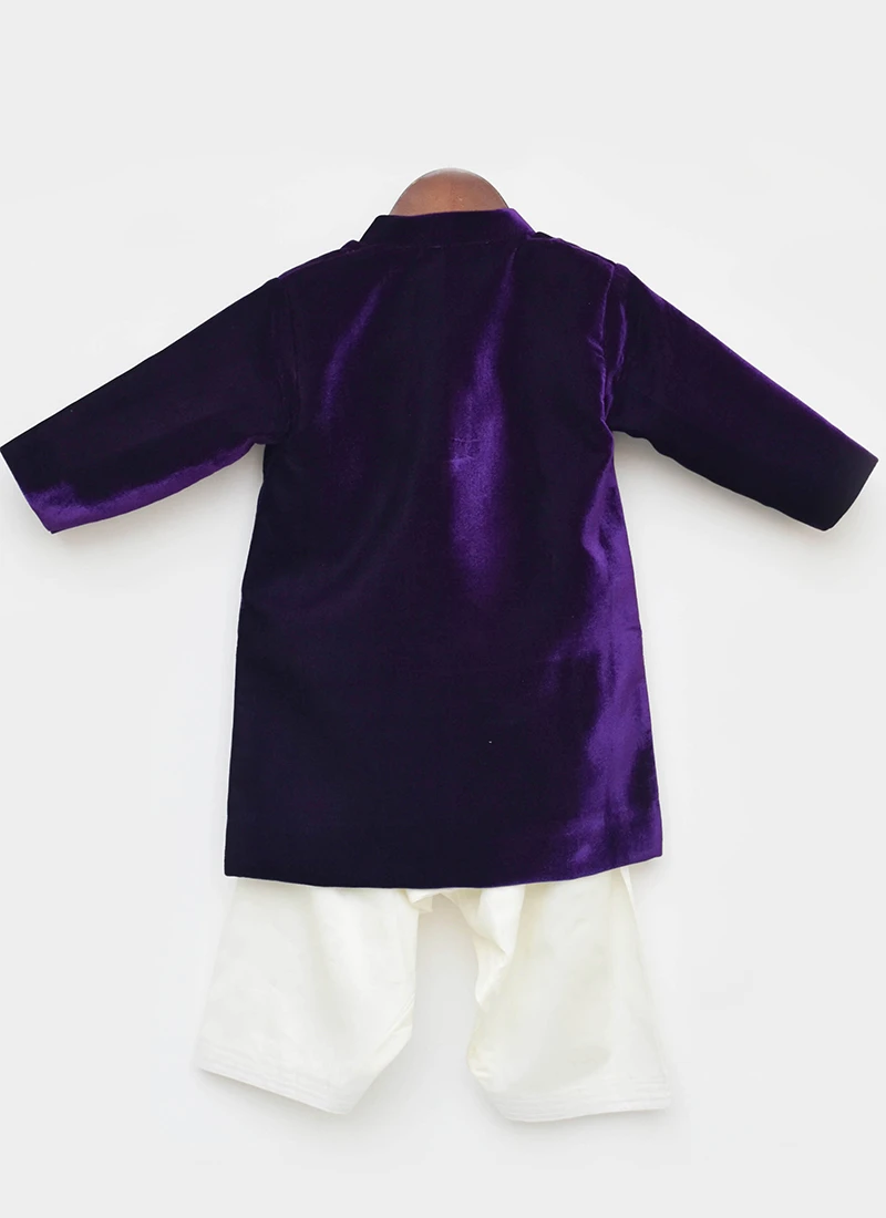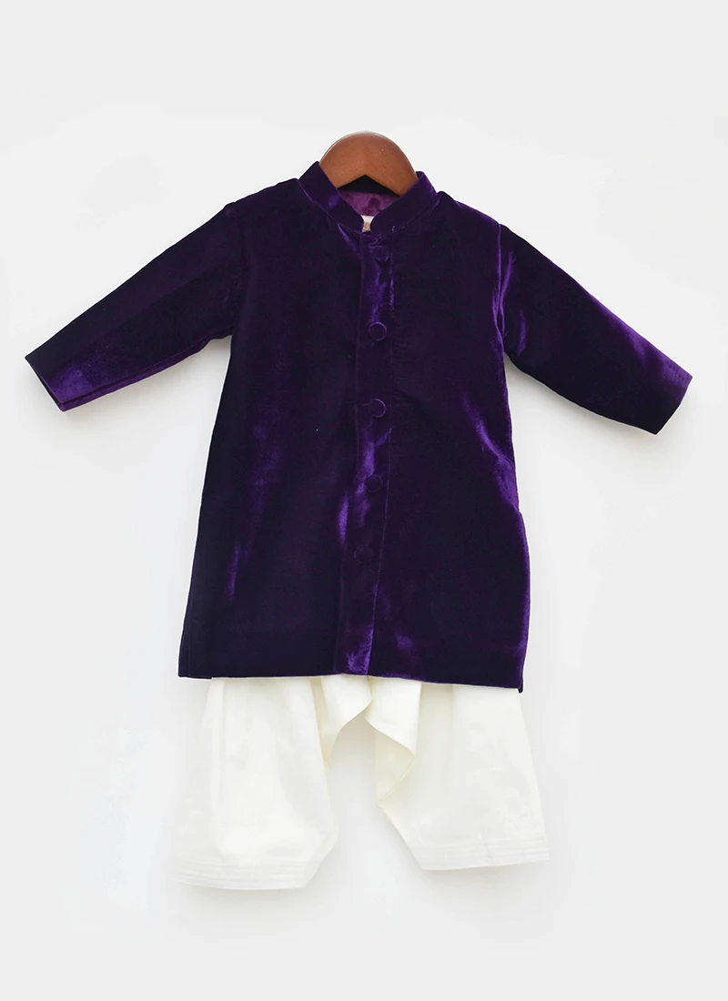 Your child looks pretty in this purple velvet classic sherwani with plain work and crafted with collar neck and full sleeves look desirable. This sherwani comes with off white cotton silk pant bottom.