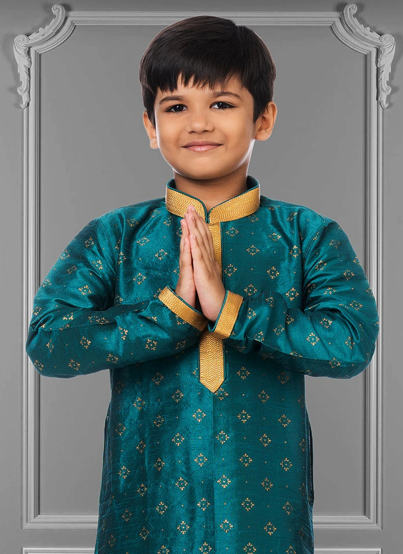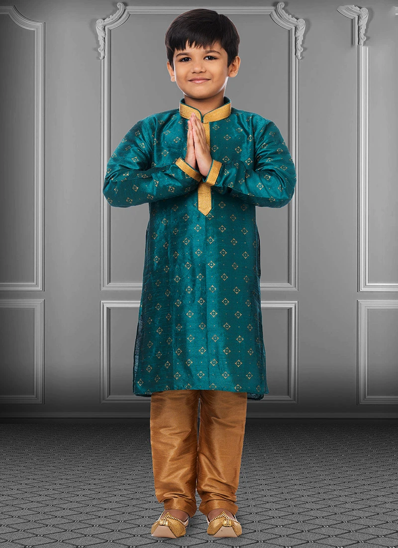 Be your own style icon with rama blue dhupion silk boys kurta pyjama enriched with foil printed work over the kurta crafted with full sleeves and mandarin collar neckstyle is representing a royalty in itself. This Kurta pyjama comes with gold dupion silk chudi pant bottom.
