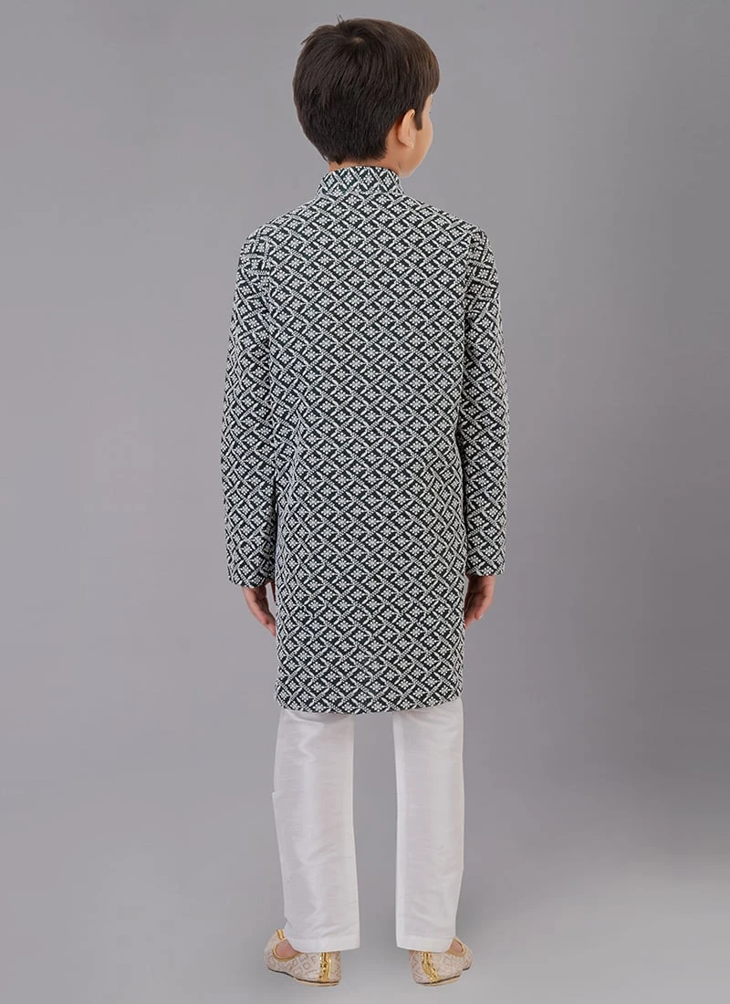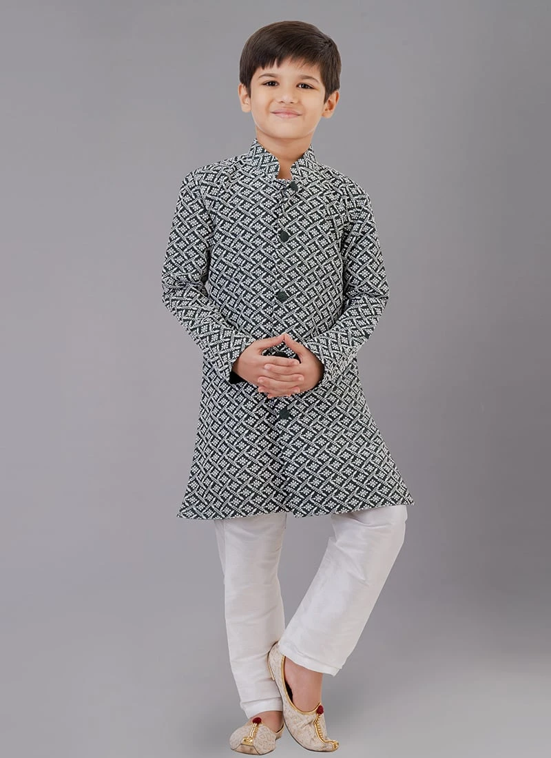 Add grace and charm on your appearance in this rama green color cotton silk kids boys kurta pyjama enriched with embroidered work over the kurta and crafted with collar neck and full sleeves is representing a royalty in itself. This kurta pyjama comes with white banarasi dupion silk chudi pant bottom.