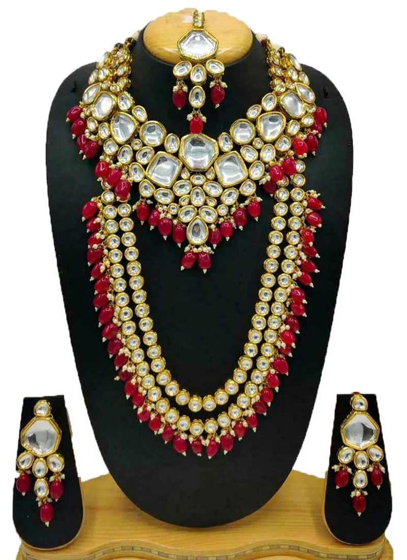 At the focal point of the necklace is the resplendent kundan pendant. Kundan a traditional form of gemsetting involves the careful placement of gemstones within a metal framework. In this case the radiant red kundan stones are arranged in a captivating pattern forming a centrepiece that demands attention. The meticulous setting of the kundan stones not only enhances their natural beauty but also adds a touch of glamour to the overall design.