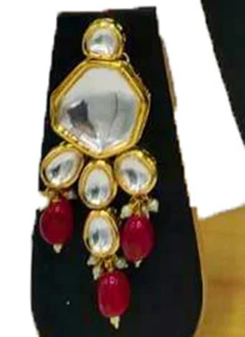 The design of the pendant is inspired by classical Indian motifs with intricate patterns and filigree work that evoke a sense of grace and sophistication. The combination of red alloy and kundan stones creates a harmonious blend of colour and texture making the necklace a statement piece that complements both traditional and contemporary attire.