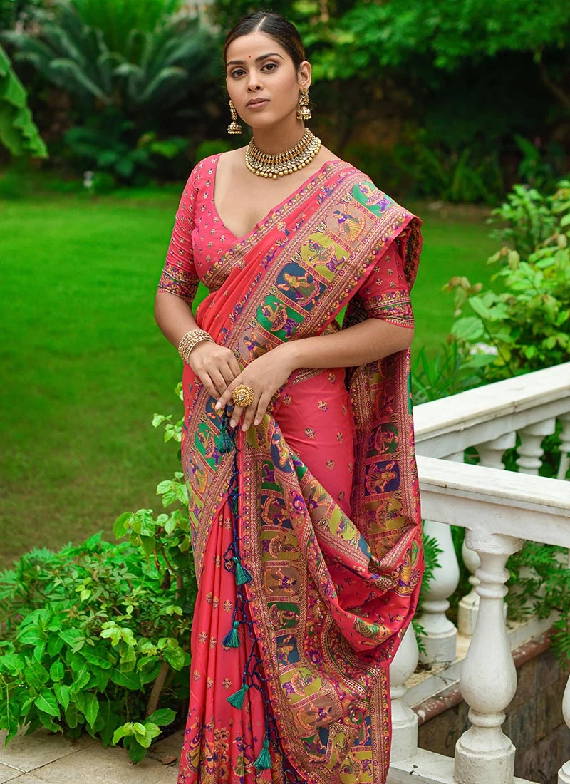 The saree is woven from luxurious Banarasi silk renowned for its lustrous texture and smooth finish. The silk fabric drapes gracefully enhancing the wearers silhouette and creating a mesmerizing effect. The intricate zari work on the saree is a testament to the skill of Benarasi artisans. Delicate golden threads are woven meticulously into elaborate patterns creating a captivating play of light and shadow.