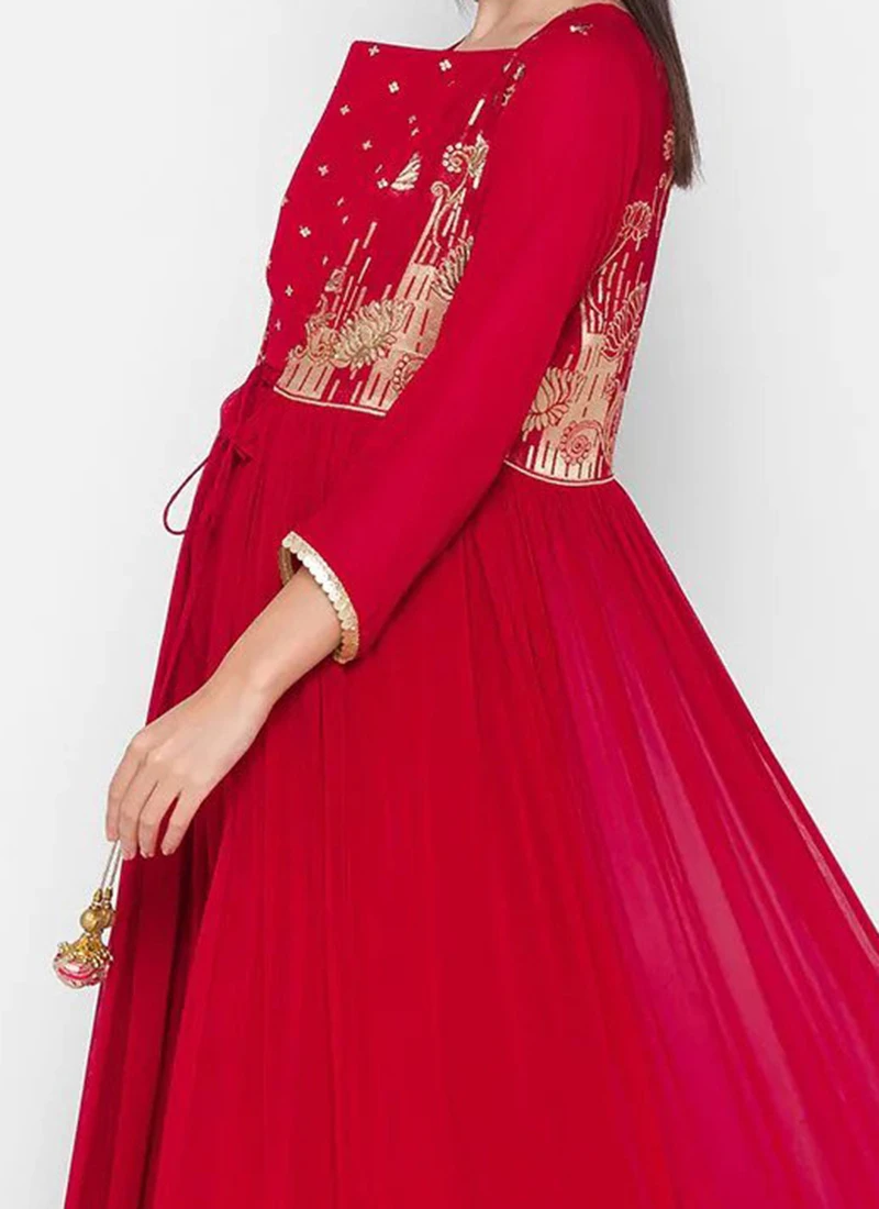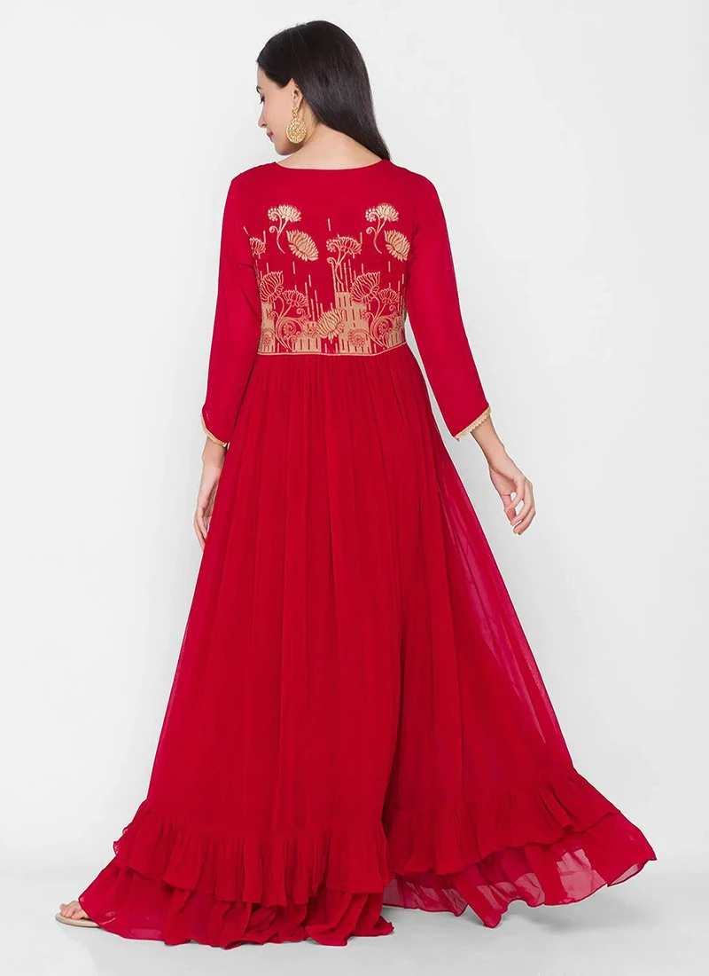 Make your dream attire look richer to your persona in this red color georgette anarkali decorative with embroidery work on the kameez looks chic and jacket comes with red color some incredible designs. Comes with matching red color palazzo pant bottom.