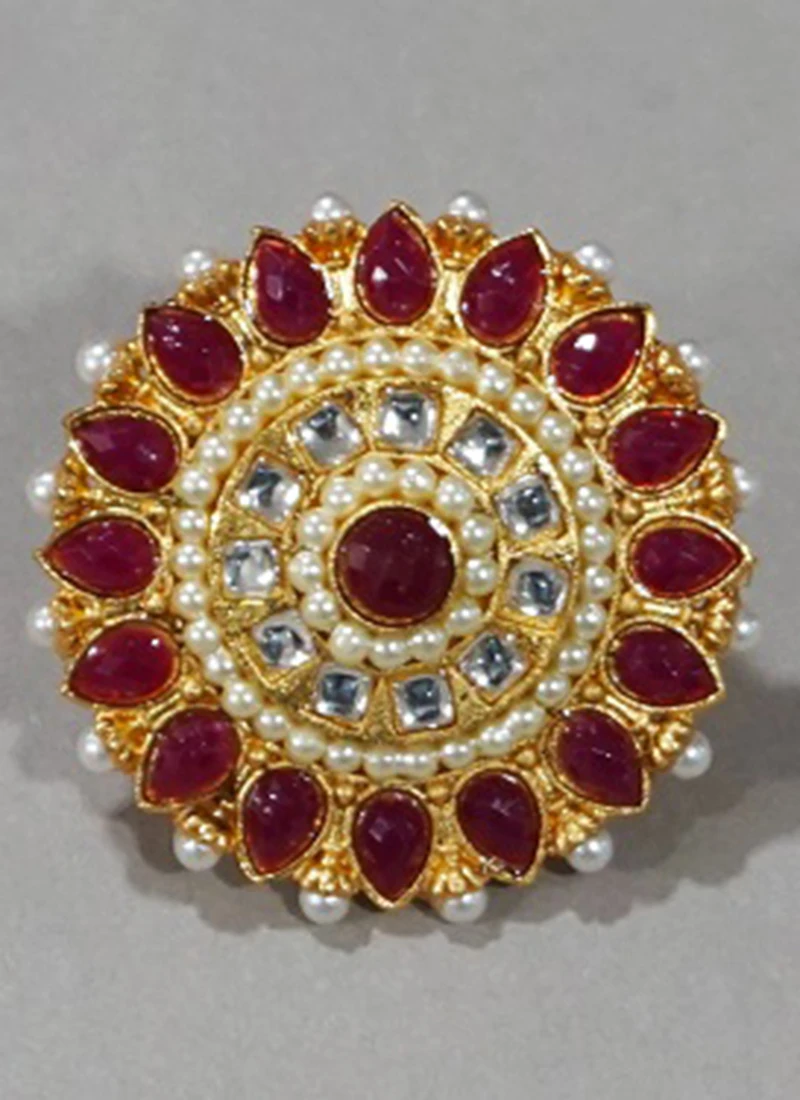 Embrace Timeless Elegance with the Red Kundan Ring. Step into a world of classic beauty and regal allure with the Red Kundan Ring. This exquisite piece of jewelry perfectly combines the richness of red Kundan stones with the durability and charm of brass metal. Meticulously crafted by skilled artisans this ring is a testament to the artistry and craftsmanship that has been cherished for generations. At the heart of the Red Kundan Ring lies the mesmerizing red Kundan stones carefully set into the brass base. Kundan a traditional gemsetting technique originating in India involves the placement of uncut gemstones within a gold or silver foil creating a captivating mosaic of colors and shine. The brilliant red hue of these stones adds a touch of opulence and glamour to the ring making it a statement piece that captures attention effortlessly. The brass metal renowned for its durability and warm golden sheen forms the foundation of this ring. The skilled artisans intricately work the brass creating delicate patterns and filigree detailing that enhances the overall charm of the design. The fusion of the red Kundan stones with the brass metal lends the ring a regal appeal perfect for adding a touch of sophistication to any ensemble. The design of the Red Kundan Ring is nothing short of captivating. The large central Kundan stone takes center stage surrounded by smaller stones and brass work that enhance its beauty. The adjustable band ensures a comfortable fit for most finger sizes allowing you to wear this stunning piece with ease and confidence. This ring isnt just a piece of jewelry it is an expression of timeless elegance and cultural heritage. The Kundan jewelry tradition has been cherished in India for centuries worn by royalty and nobility to exude grace and charm. By adorning this ring you not only embrace its aesthetic beauty but also connect with a rich legacy that celebrates the artistry and craftsmanship of the past. The Red Kundan Ring is incredibly versatile adding a touch of opulence to various occasions and outfits. Whether youre pairing it with a traditional Indian attire a glamorous evening gown or even a fusion ensemble this ring complements your style with finesse and allure. In conclusion the Red Kundan Ring is a celebration of timeless elegance and cultural heritage. Its captivating design adorned with red Kundan stones and intricate brass work promises to make a lasting impression wherever you go. Embrace the regal allure and grace your fingers with this stunning piece of jewelry that embodies the essence of classic beauty and sophistication.