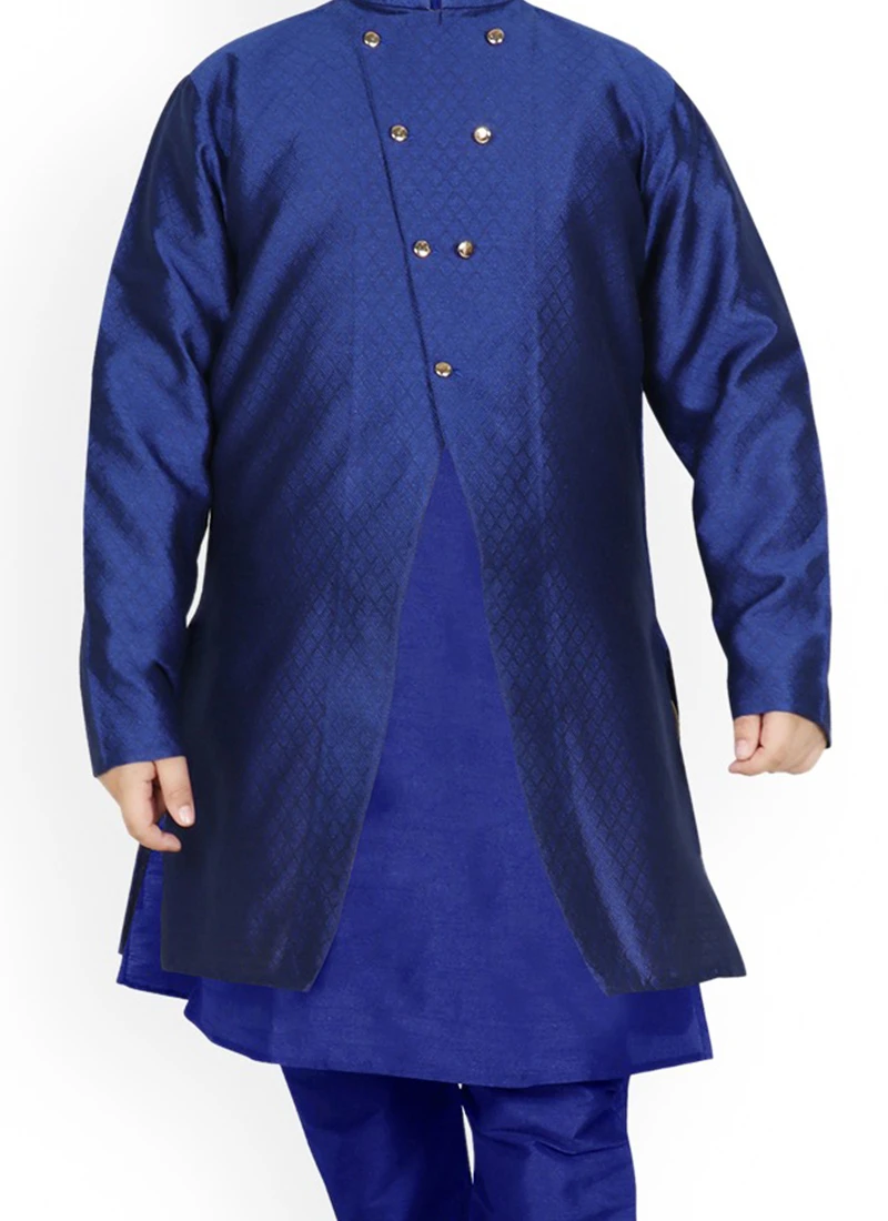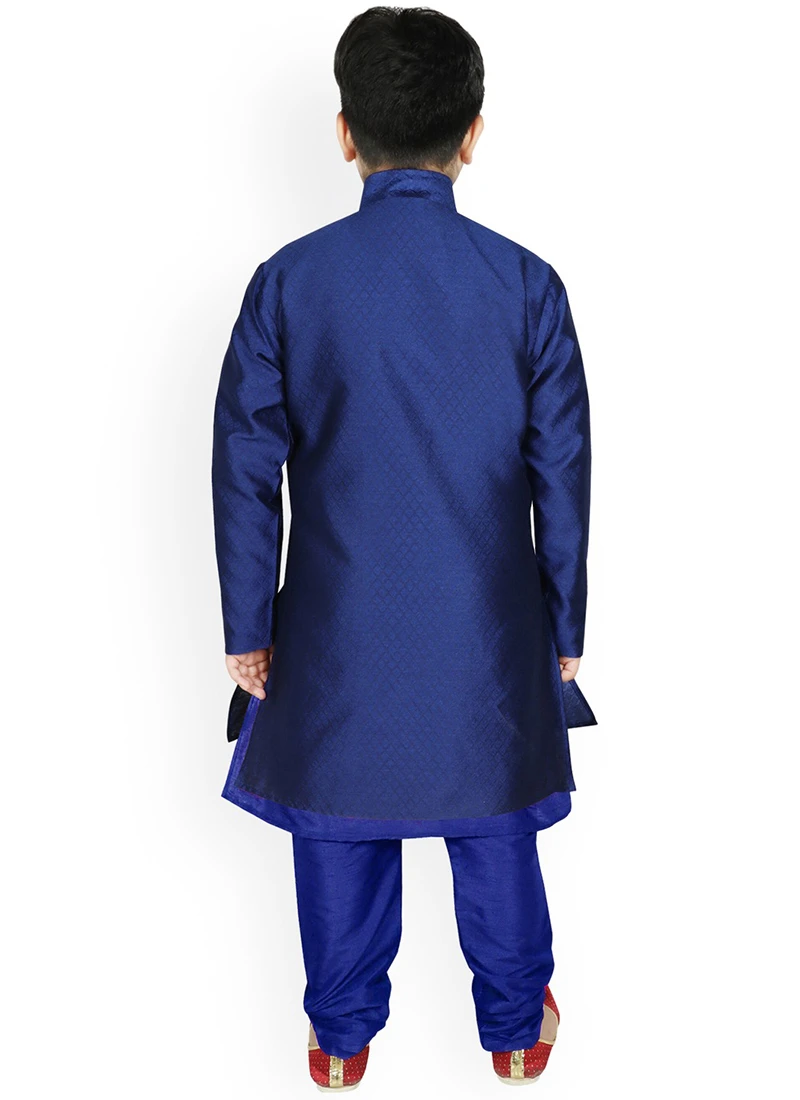 Style and trend will be at the peak with this royal blue dupion silk kids boys kurta pyjama crafted with mandarin collar neck and full sleeves enriched with soild plain work in the angrakha kurta. This kurta pyjama comes with royal blue dupion silk chudi pant bottom. The jacket comes with royal blue textured silk with brocade work.pant bottom. The jacket comes with royal blue textured silk with brocade work.