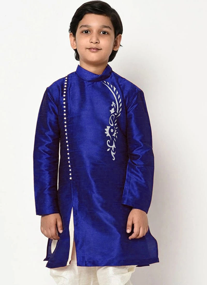 Royal Blue dupion silk kids boys kurta pyjama crafted with mandarin collar neck and full sleeves enriched with embroidered work in the angrakha kurta is representing a royalty in itself. This kurta pyjama comes with white dupion silk dhoti bottom.