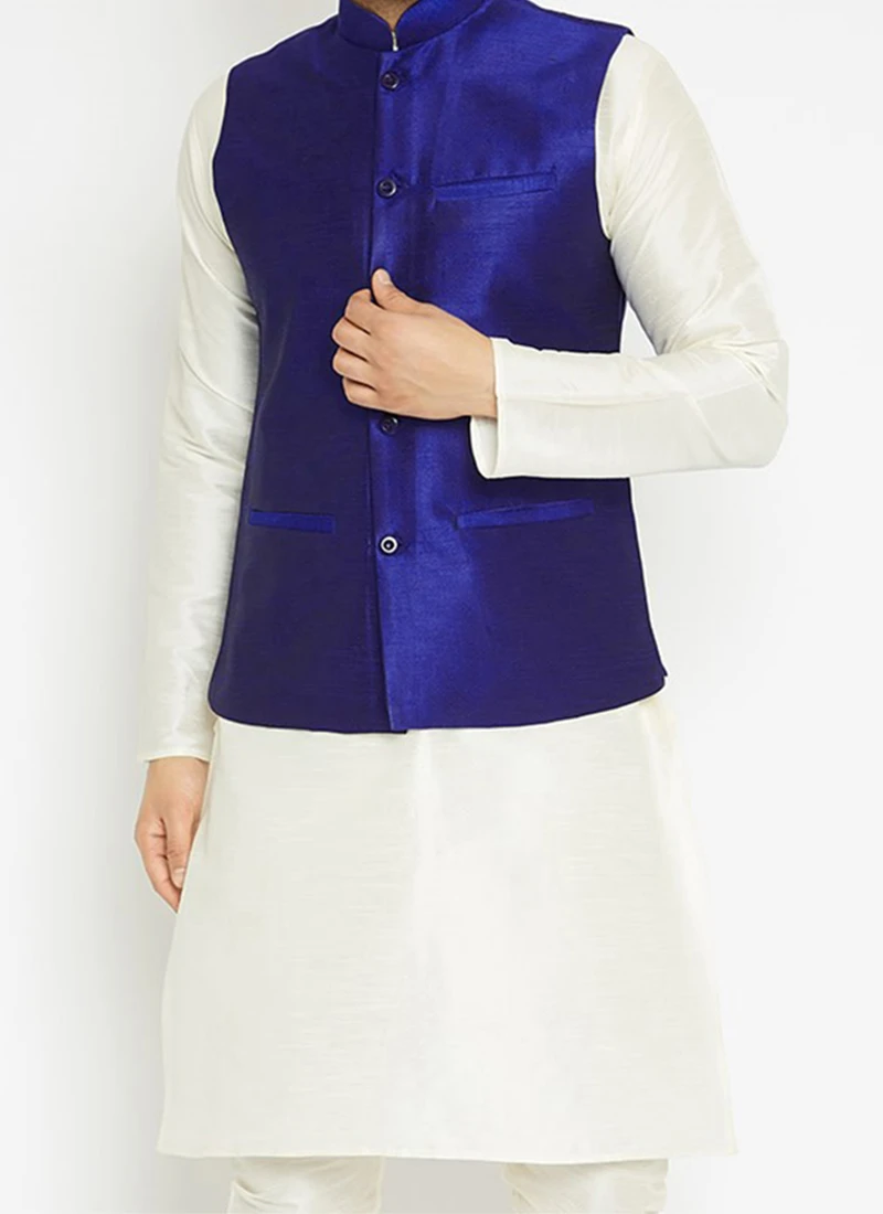 Be your own style icon in this royal blue dupion silk Nehru Jacket. This attire is encrafted with solid stitched work with pockets.