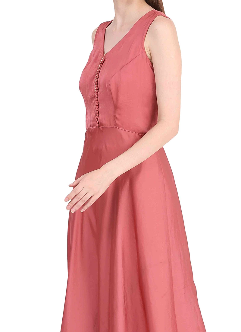 Steal the hearts away with this rust color satin anarkali suit. This lovely kameez comes with plain work over the dress and crafted with V neckline and sleeveless looks chic. This suit comes with gold shantoon chudi pant bottom and rust color net with lace border dupatta.ace border dupatta.