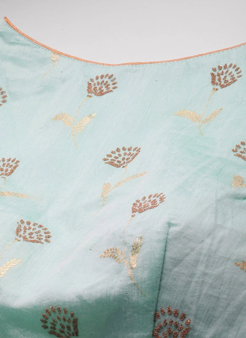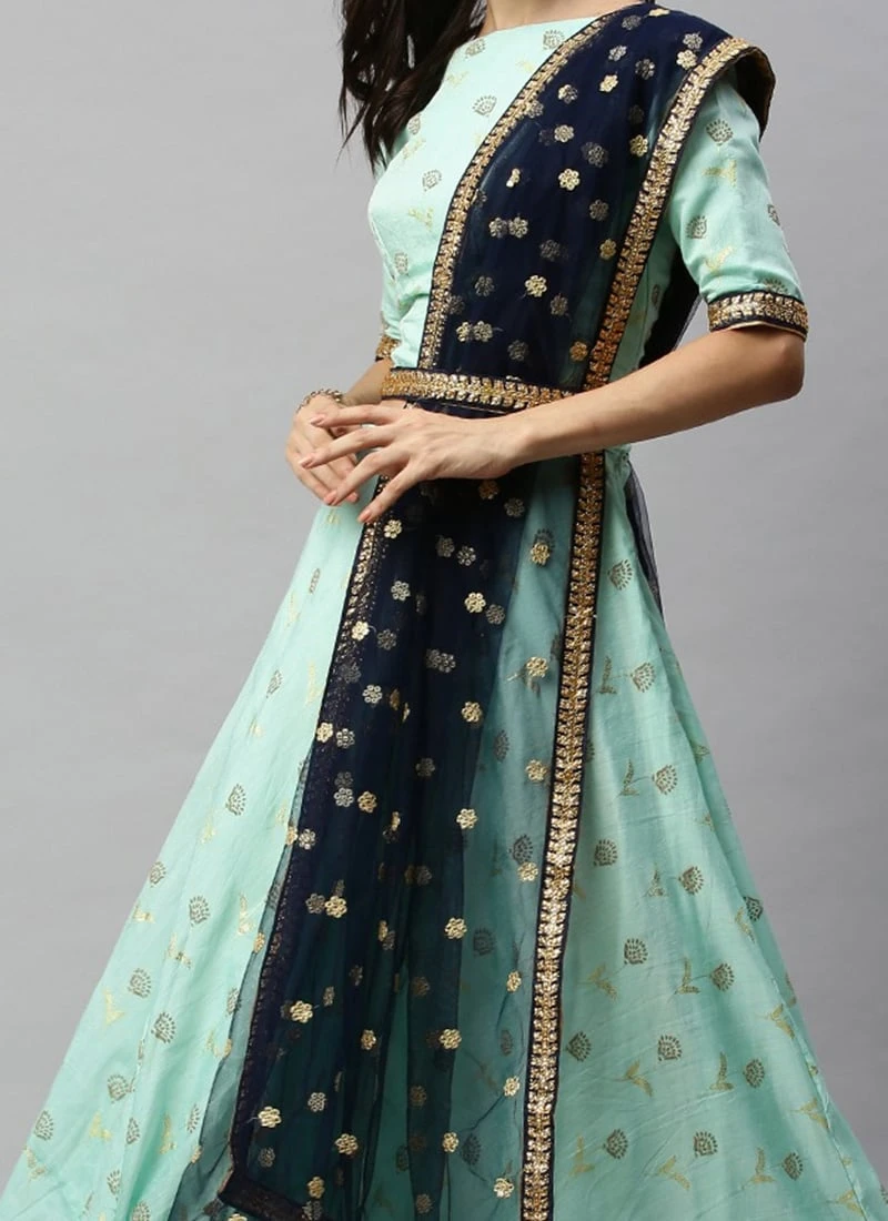 Presentinga sea blue cotton and blue lehenga set, features a sea blue cotton blouse till natural waist length, with boat neckline in the front and low neckline with tassels detailing closure in back,side zipper opening, elbow sleeve with trim detailing.The blouse comes with detachable belt with nice trim.The sea blue cotton bottom is of the contoured waist band with hooks and zipper opening , bottom comes with medium flare till floor length.It is paired up with blue embroiderer net dupatta adorned with borders on all four sides.Mask only for shoot purposes.Refer the fabric image for true color of the dress. This dress is custom designed from fabric and custom stitched. Once sold cannot be returned.Designs, colors, and patterns on the actual product may slightly vary from designs shown in the image. Images are the only representative