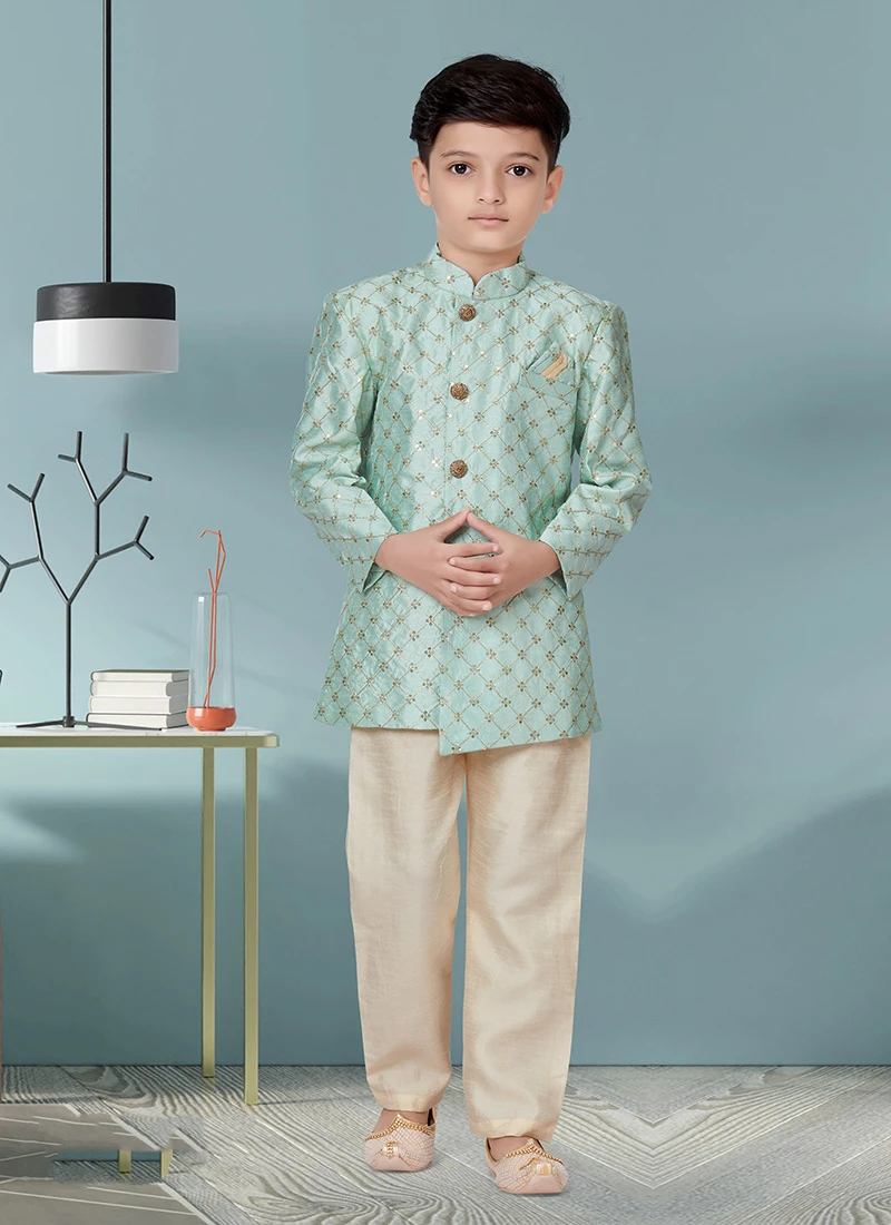 Your kid special days will trend up with this sea green banarasi silk indowestern sherwani. Sequins work makes more attractive to this sherwani crafted with collar neck and full sleeves. This sherwani comes with off white silk dupion chudi pant bottom.