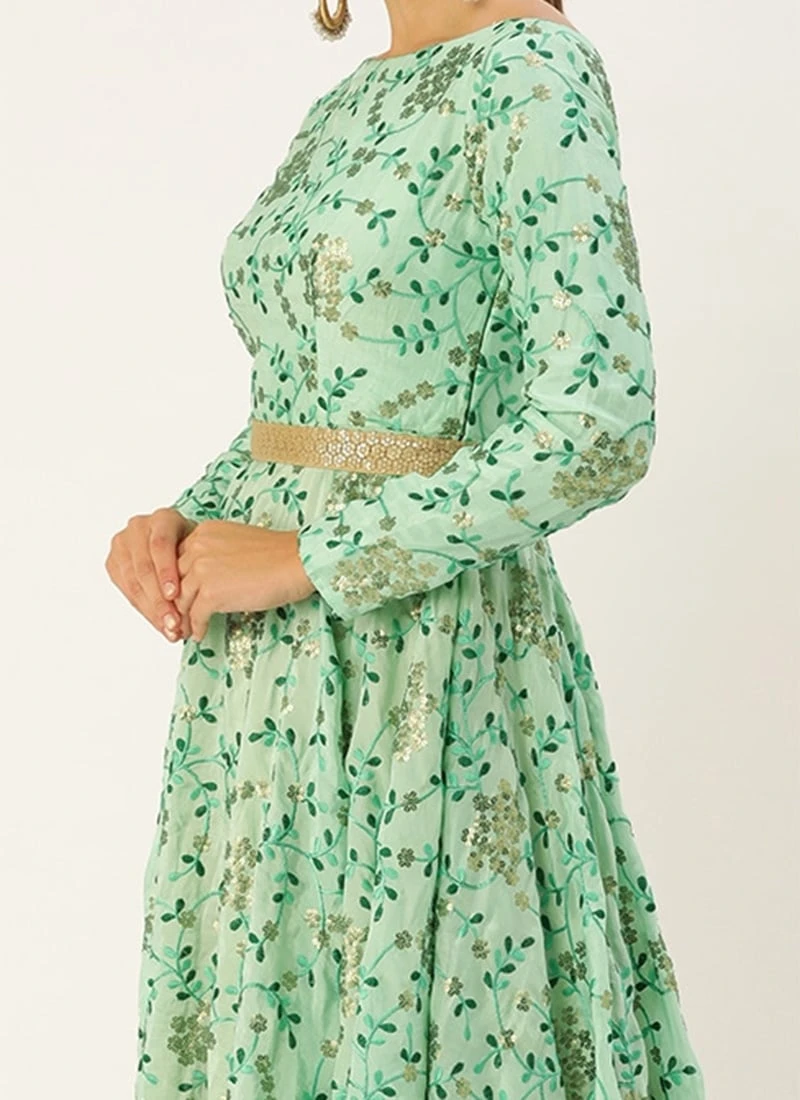 Presenting a sea green embroidered gown, feature with sea green embroidered fabric gown has boat neckline at front and boat neckline with keyhole at back, full sleeve, side zip closure, yoke till natural waist,comes with two layered gown, it has beige net fabric till floor length with minimum flare gown, and sea green fabric as above layer as asymmetrical layer minimum flare gown, highest length till knee length and lowest length till ankle length. Gown has detectable band with embellished trim. Mask only for shoot purposes.Refer the fabric image for true color of the dress. This dress is custom designed from fabric and custom stitched. Once sold cannot be returned.Designs, colors, and patterns on the actual product may slightly vary from designs shown in the image. Images are the only representative