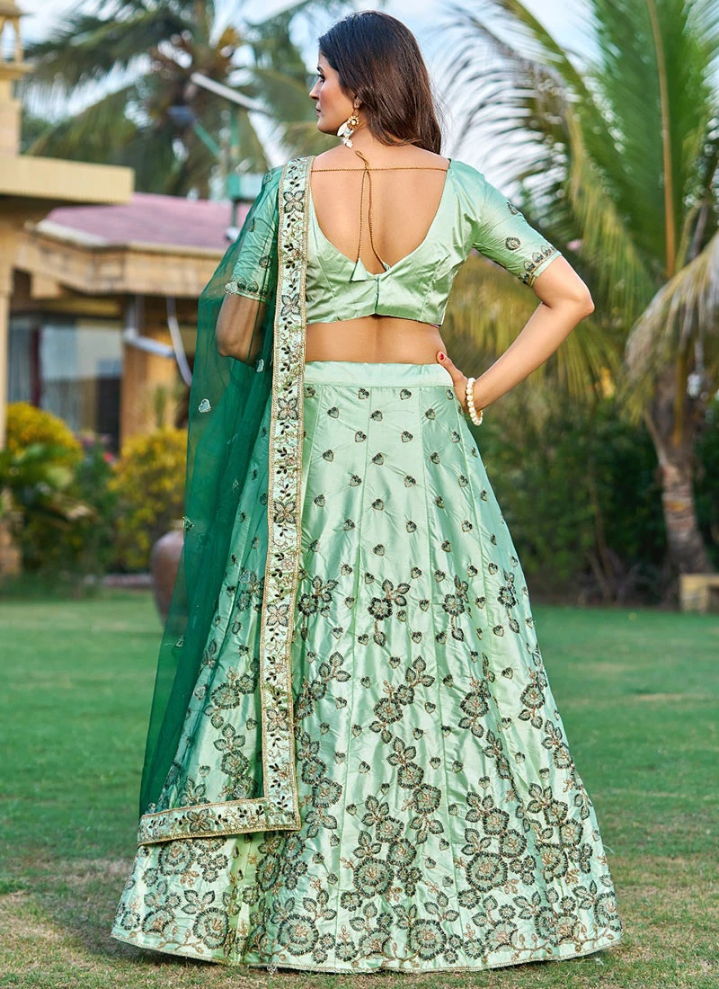Crafted from a luxurious blend of satin and other fine materials this lehenga showcases a sumptuous sea green colour. The choice of satin not only imparts a soft and smooth texture but also gives the outfit a subtle sheen creating a luminous effect that adds to its overall allure.