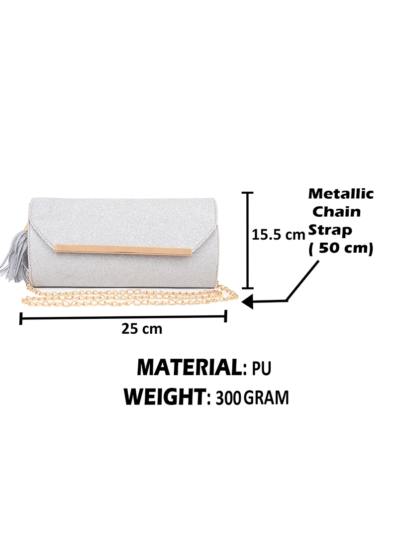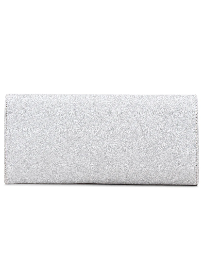 The designer silver polyster clutch with some designs and magnetic closure.