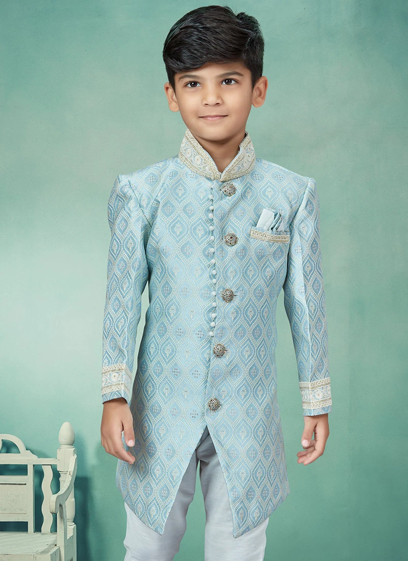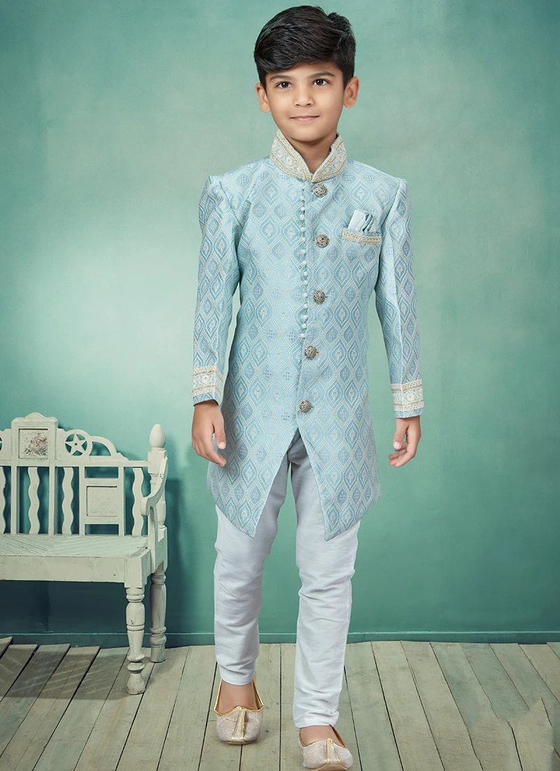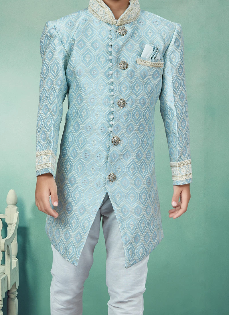 Add style to your boy towards the appearance in this sky blue art silk boys indowestern sherwani enriched with embroidered work over the sherwani crafted with full sleeves and mandarin collar neckstyle is representing a royalty in itself. This sherwani comes with off white silk dupion chudi pant bottom.mes with off white silk dupion chudi pant bottom.