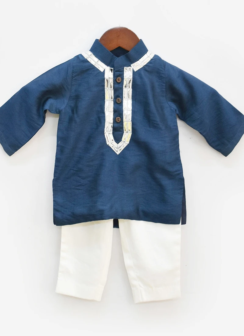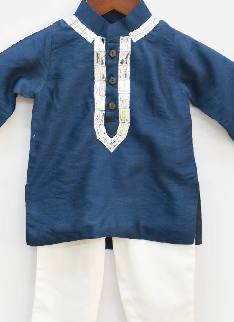 Style and trend will be at the peak in this teal blue cotton silk kids boys kurta pyjama. It looks chic and ideal in this tikki work crafted with full sleeves and collar neckstyle . This set comes with off white cotton silk straight pant bottom .