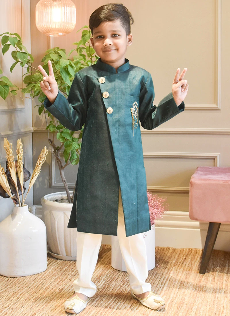 Outstanding craftmanship of exhibited in this teal green art silk boys classic sherwani enriched with printed work over the kurta crafted with full sleeves and mandarin collar neckstyle is representing a royalty in itself. This sherwani comes with cream art silk straight pant bottom.