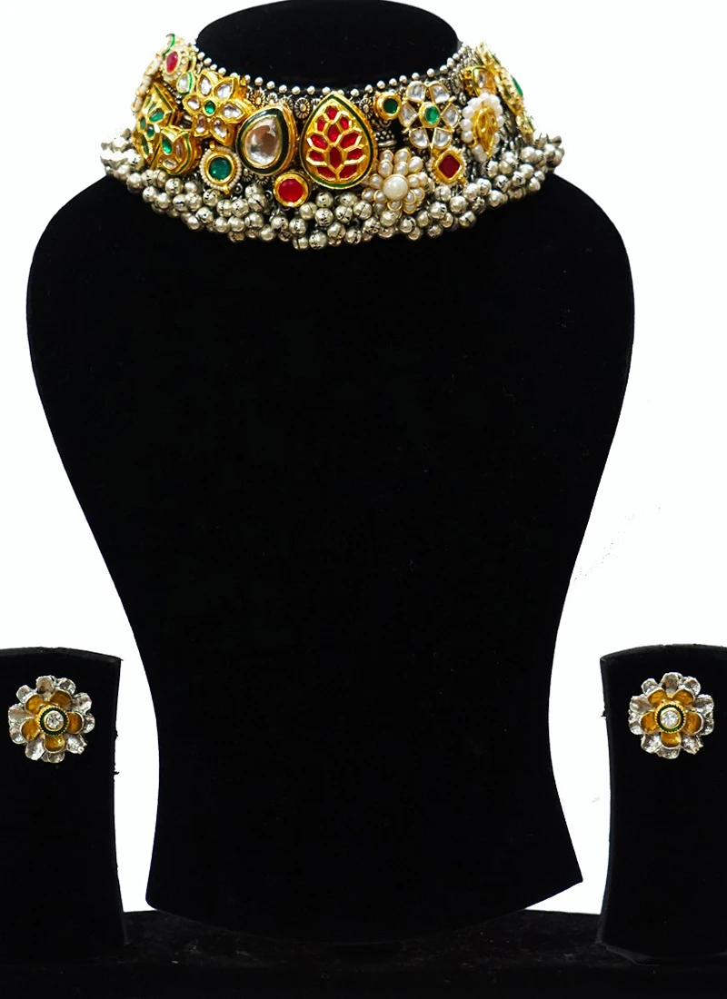 The Tribal Elegant GoldPlated Choker is a mesmerizing masterpiece that effortlessly blends the allure of tribal aesthetics with the opulence of gold plating. This striking choker necklace is a celebration of artistic fusion capturing the essence of cultural heritage while embracing the contemporary elegance that modern women seek. Crafted with meticulous care and attention to detail the Tribal Elegant GoldPlated Choker stands as an exquisite emblem of cultural diversity and refined craftsmanship. Drawing inspiration from the diverse tapestry of tribal art and design the Tribal Elegant GoldPlated Choker showcases a harmonious amalgamation of traditional motifs and contemporary elements. The chokers pendant features intricate patterns and symbols reminiscent of tribal heritage and the stories they embody. The delicately etched tribal motifs narrate tales of ancient rituals natural wonders and the rich legacy passed down through generations. The chokers undeniable allure is further heightened by its lustrous gold plating which bestows a captivating radiance upon the piece. The gold plating adds a touch of luxury and grandeur elevating the choker to a level of sophistication fit for special occasions and formal gatherings. The gleaming surface reflects light gracefully creating a mesmerizing play of glimmers that enhance the wearers elegance. Crafted by skilled artisans the Tribal Elegant GoldPlated Choker exemplifies exceptional craftsmanship. The pendants intricate engravings are the result of painstaking precision each stroke reflecting the dedication and passion poured into its creation. The chokers seamless design and flawless finish add to its visual appeal making it a true work of art. The Tribal Elegant GoldPlated Choker seamlessly transitions between traditional and contemporary styles adding a touch of grace and sophistication to any outfit. Whether paired with an ethnic ensemble for cultural celebrations or worn with modern attire for a touch of elegance this choker complements the wearers individual style with effortless charm. Beyond its aesthetic charm the Tribal Elegant GoldPlated Choker serves as a cultural symbol representing the unifying power of artistic fusion. It stands as a testament to the beauty that arises when different worlds converge bridging the past with the present. Embracing this choker is a nod to the appreciation of diverse cultures and the richness they bring to our lives. The Tribal Elegant GoldPlated Choker is more than just a piece of jewelry it is an embodiment of artistry and cultural fusion. With its enchanting blend of tribal motifs and opulent gold plating this choker captures the essence of heritage and modern allure. As it adorns the neck of the wearer it becomes a dazzling symbol of cultural appreciation and artistic beauty transcending time and trends with its enduring grace.
