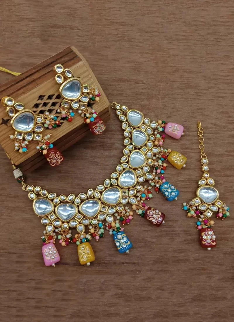 One of the standout features of this necklace is the intricate Kundan work adorning its surface. Kundan is a traditional Indian jewellerymaking technique that involves setting gemstones usually glass imitations in a gold or silver framework. The meticulous craftsmanship of the Kundan work gives the necklace a regal and opulent appearance reminiscent of traditional royal jewellery.