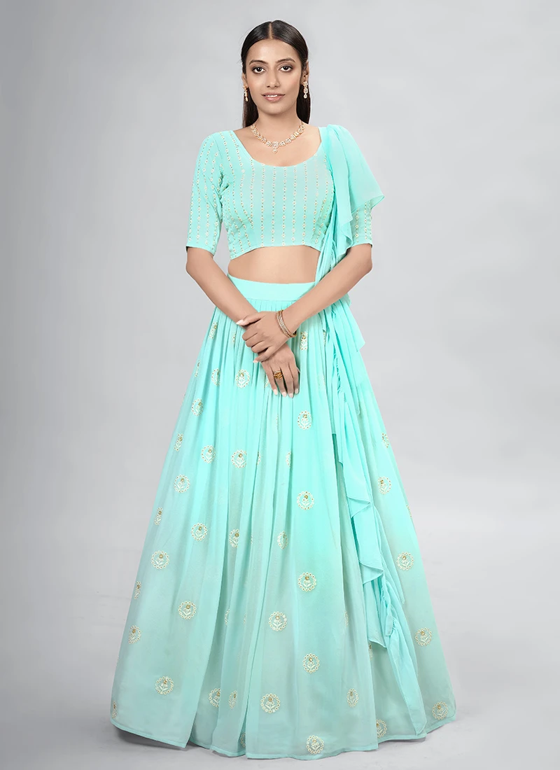 Comes with semi -stitched lehenga, un stitched choli and dupatta fabric. To have it stitched, please select the custom tailoring options. Lehenga with elaborate patterns and colors are used for photo-shoot. Color and pattern of the lehenga might not be as shown in the image.