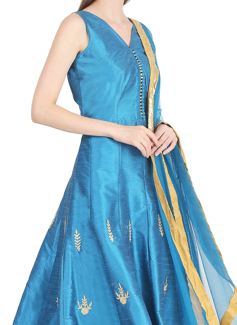 Be the first to review “Turquoise Raw Silk Embroidery Anarkali Suit Party Wear” Cancel reply
