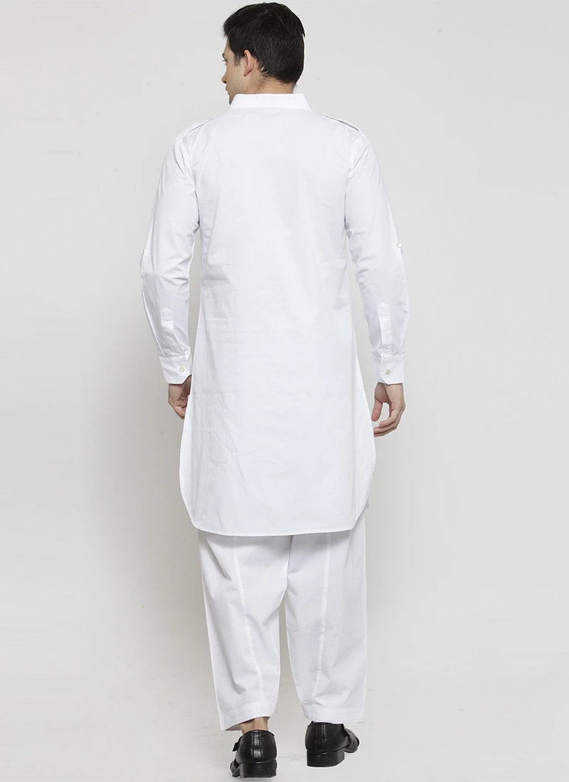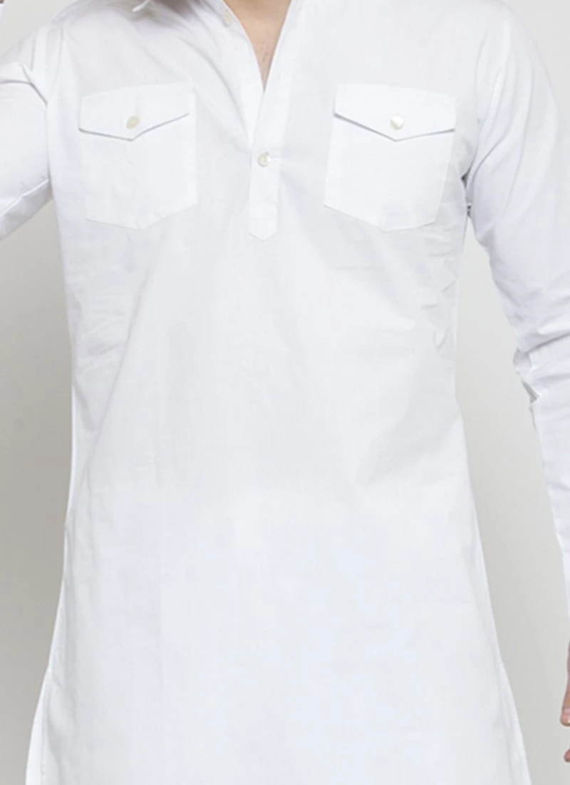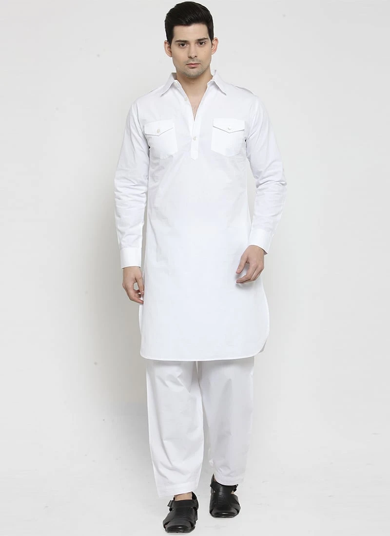 Flattering white color pathani set planed on blended cotton fabric with plain work is to make a bold statement. Celebrate your moments with this flattering outfit. Comes with matching bottom.