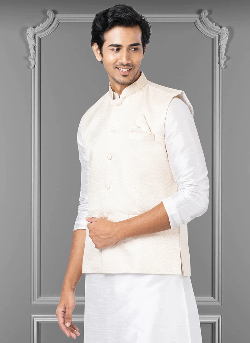 You will be confident to make a impressive fashion statement with this white diamond silk nehru jacket crafted with mandarin collar neck and sleeveless enriched with soild plain work is representing royalty in itself.