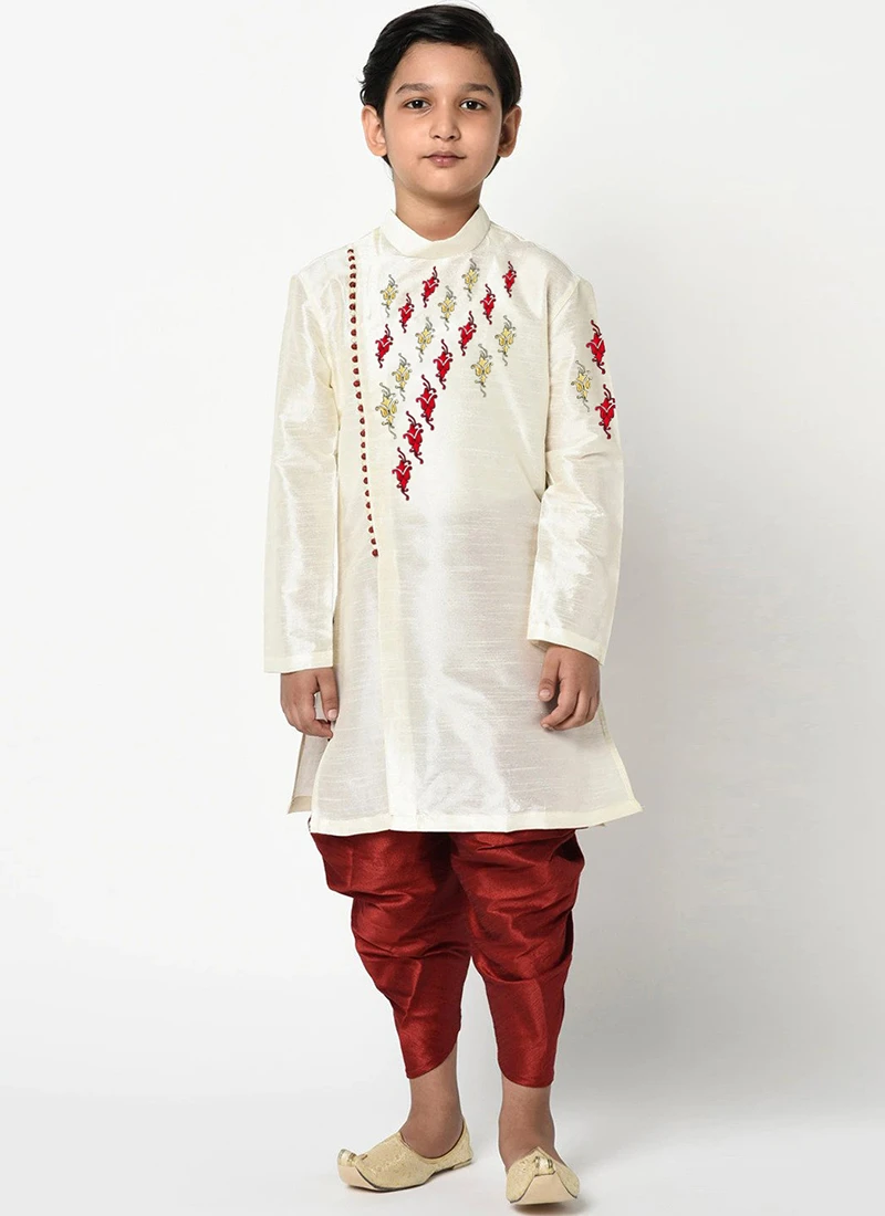 You will be confident to make a fashion statement with this white dupion silk kids boys kurta pyjama crafted with mandarin collar neck and full sleeves enriched with thread embroidered work in the angrakha kurta is representing a royalty in itself. This kurta pyjama comes with maroon dupion silk dhoti pant bottom.