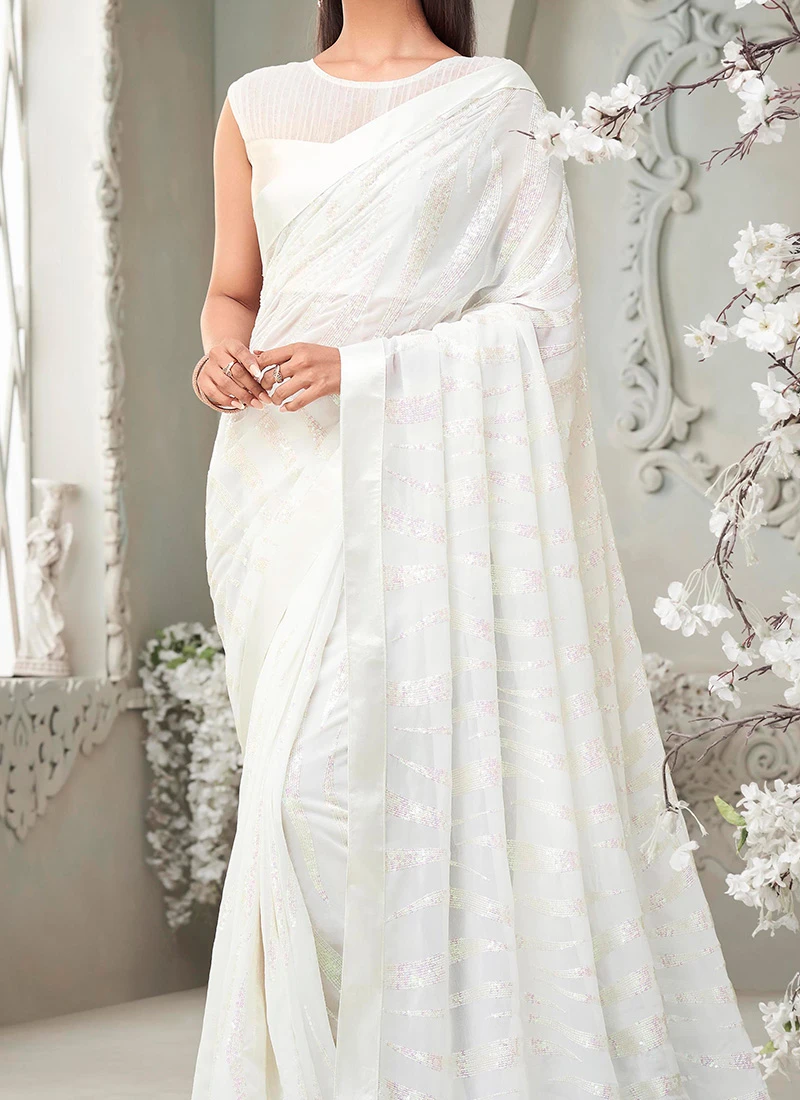 In summary the White Faux Georgette Sequins Saree is a symbol of sophistication beauty and craftsmanship. Its exquisite sequins work combined with the purity of white georgette creates a mesmerizing ensemble that will make you the center of attention at any event. Embrace the timeless allure of this saree and make a memorable fashion statement wherever you go.