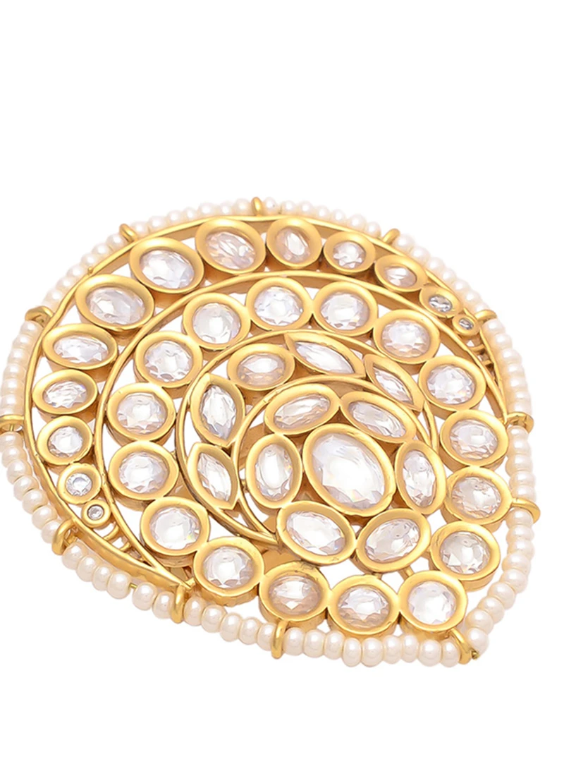 The designer golden plated ring comes with kundan studded on it and white beads stringed on the ring.