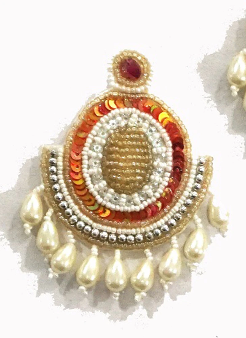 The dangling earrings are adorned with carefully chosen gemstones and crystals that add a touch of glamour and sparkle. These stones are expertly set reflecting light in a way that accentuates the natural beauty of the wearer. The combination of the white base and the fiery orange stones creates a mesmerizing effect making these danglers the focal point of any ensemble.