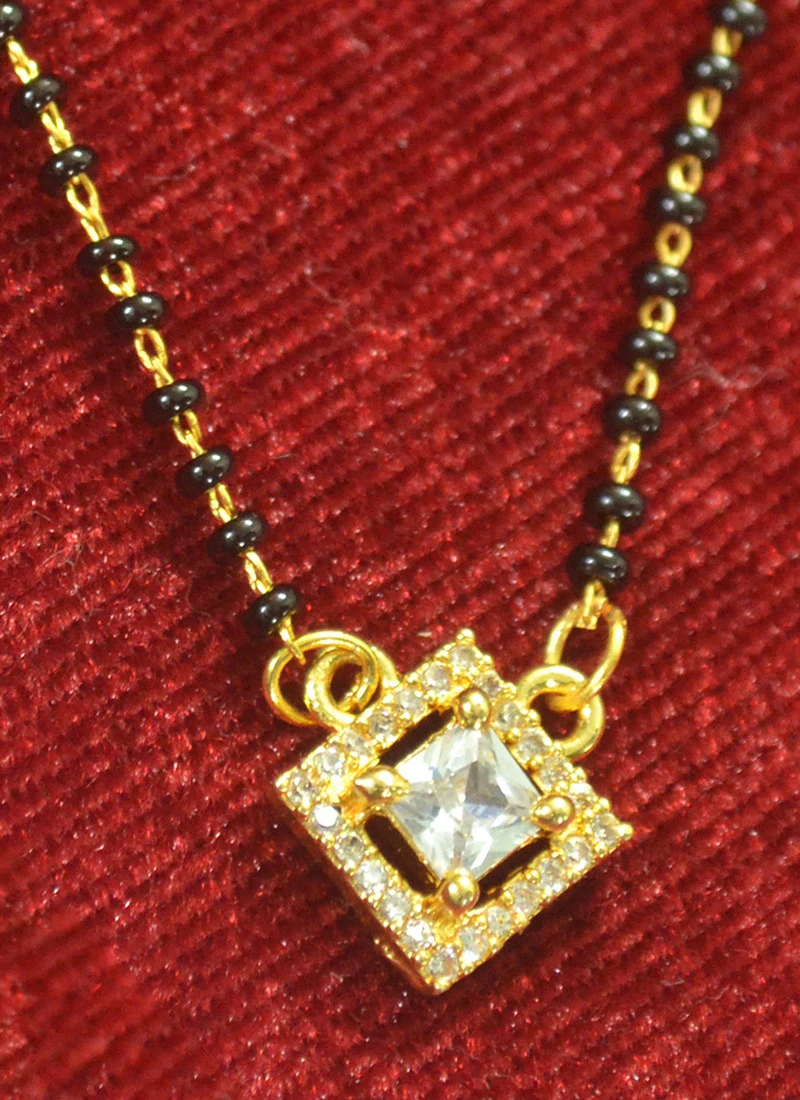 Golden Plated long traditional mangalsutra decorative with white stones work with simple one line chain with black beads.